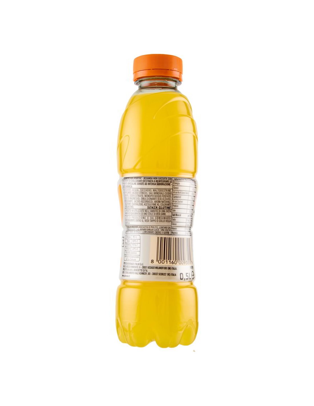 Zutaten: Wasser, Zucker, Maltodextrin, Säuerungsmittel (Zitronensäure), Mineralsalze (Natriumchlorid, Natriumcitrat, Monokaliumphosphat, Magnesiumoxid), Emulgatoren (E414, E445), Antioxidationsmittel (Ascorbinsäure), natürliche Aromen, Süßungsmittel (Sucralose, Acesulfam K), Farbstoff (Beta-Carotin).
