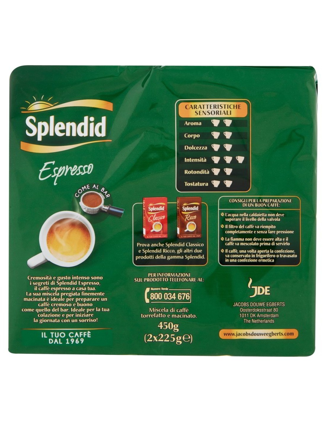 Hinter jeder Packung Splendid Espresso steckt eine sorgfältige Auswahl von Bohnen — eine Kombination aus Robusta und Arabica — geröstet, um diese anhaltende Cremigkeit und den intensiven Geschmack zu entwickeln, der einen mittelmäßigen Espresso von einem unterscheidet, der es wert ist, genossen zu werden. Die feine Mahlung ist kalibriert, um jede Geschmacksnote hervorzuheben und garantiert eine dichte Crema in der Tasse und einen Geschmack, der lange auf dem Gaumen verbleibt.