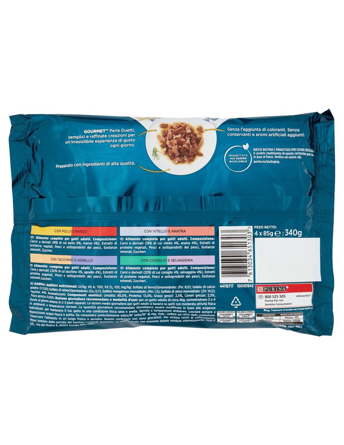 Das Gourmet Perle Multipack mit 4 Beuteln bringt Huhn, Truthahn, Kalbfleisch und Kaninchen auf den Tisch — vier köstliche Überraschungen in Sauce, um jeden Tag den anspruchsvollsten Gaumen im Haus zu erobern.