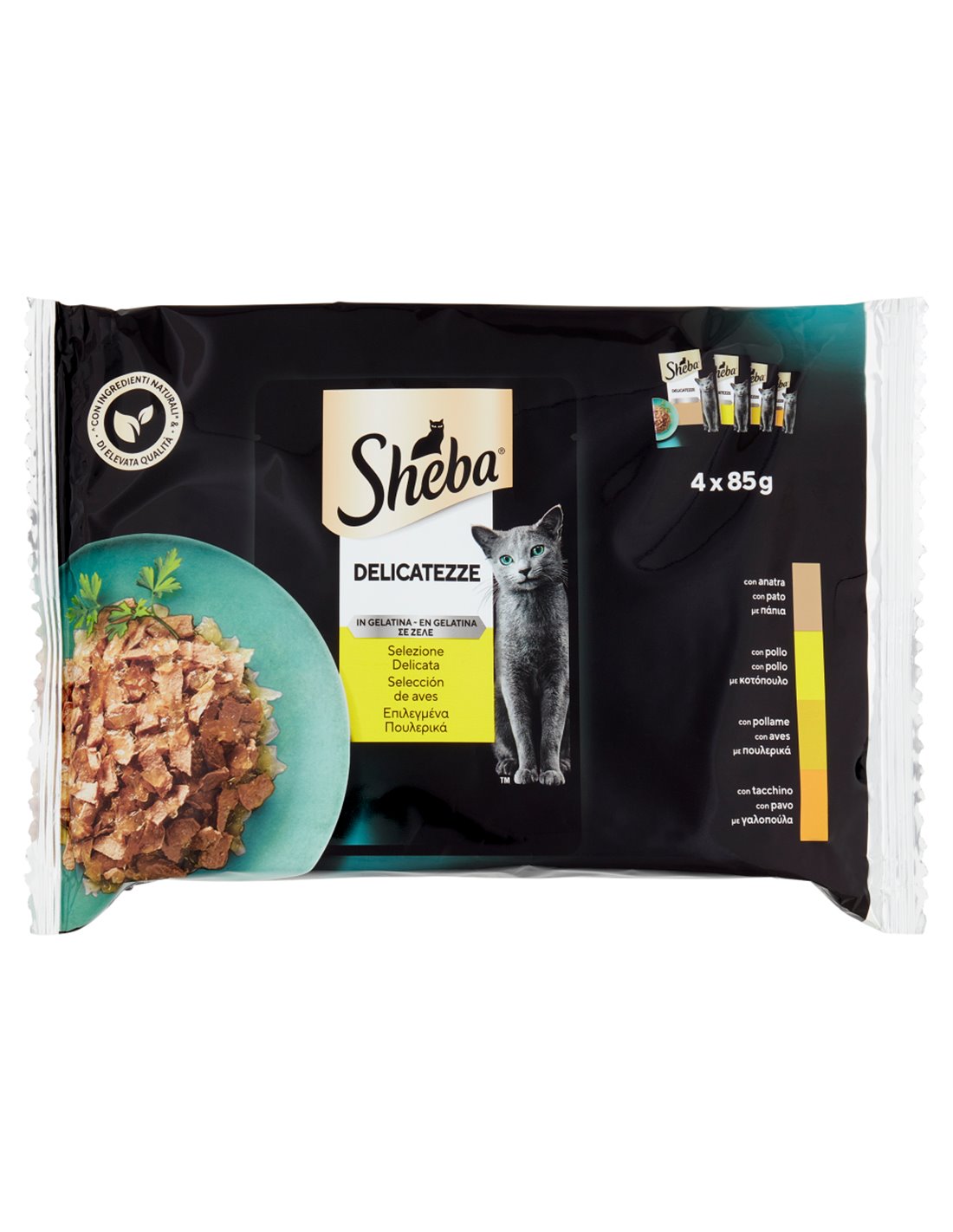Sheba hat diese Linie von Happen in Gelee entwickelt, um eine typische Eigenschaft von Katzen zu erfüllen: die Neigung zur Nahrungsneophilie, also die Anziehung zu immer neuen Geschmacksrichtungen. Die Zarte Auswahl mit weißem Fleisch ist besonders für erwachsene Katzen mit empfindlichem Verdauungssystem geeignet, die von leichten und leicht verdaulichen tierischen Proteinen profitieren.