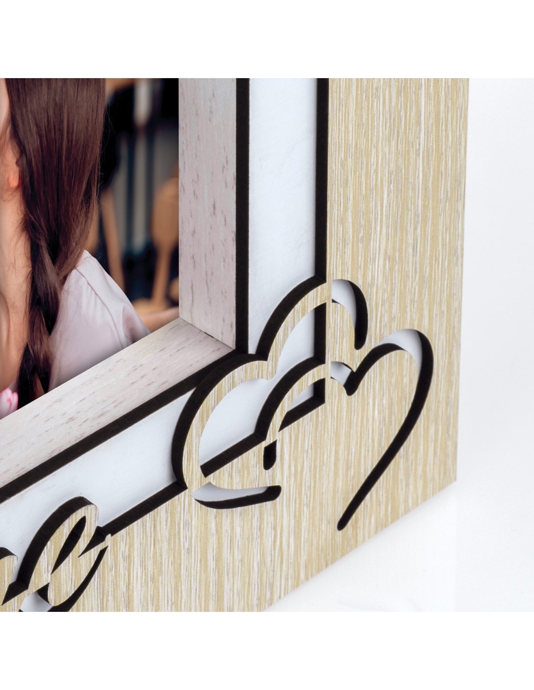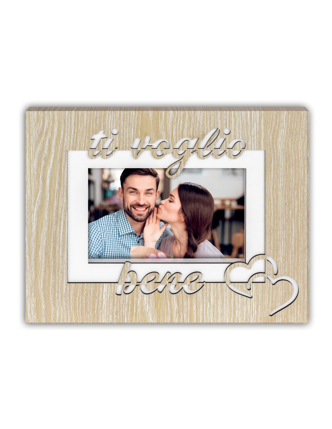 Cornice Angela IT in legno, colore marrone naturale, con scritta a rilievo traforata, TI VOGLIO BENE, da tavolo o da parete, adatta come regalo, ideale per celebrare anniversari o compleanni, adatta per casa e ufficio, idea regalo originale.