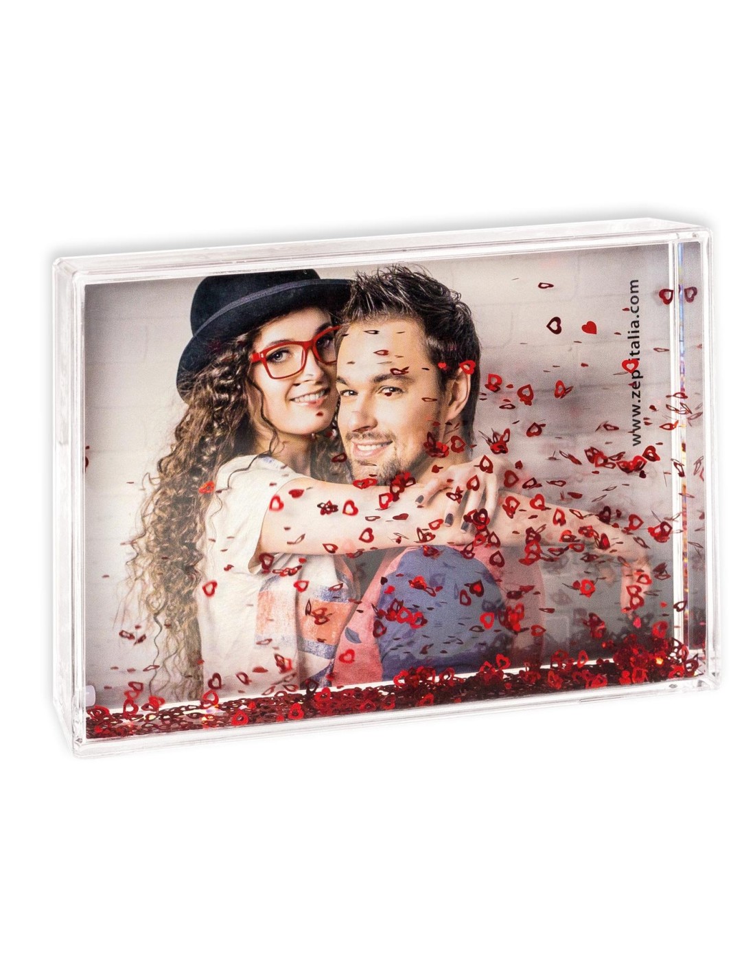 Shake Frame Heart, cornice in acrylico effetto trasparente, con spazio per inserire una foto, con acqua e cuoricini fluttuanti, idea regalo originale, adatto al tema dell'amore.