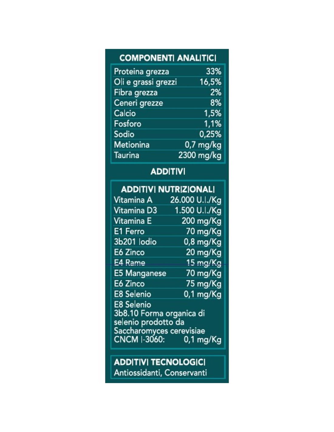 Composition : Viande déshydratée (poulet 36%, dinde 14%), poulet et dinde frais min. 4%, riz, maïs, graisses animales, protéine de maïs, levure de bière, pulpe de betterave déshydratée, substances minérales, graines de lin (source naturelle d'Oméga 3 0,5%), prébiotiques (fructo-oligosaccharides FOS, manno-oligosaccharides MOS), yucca schidigera.