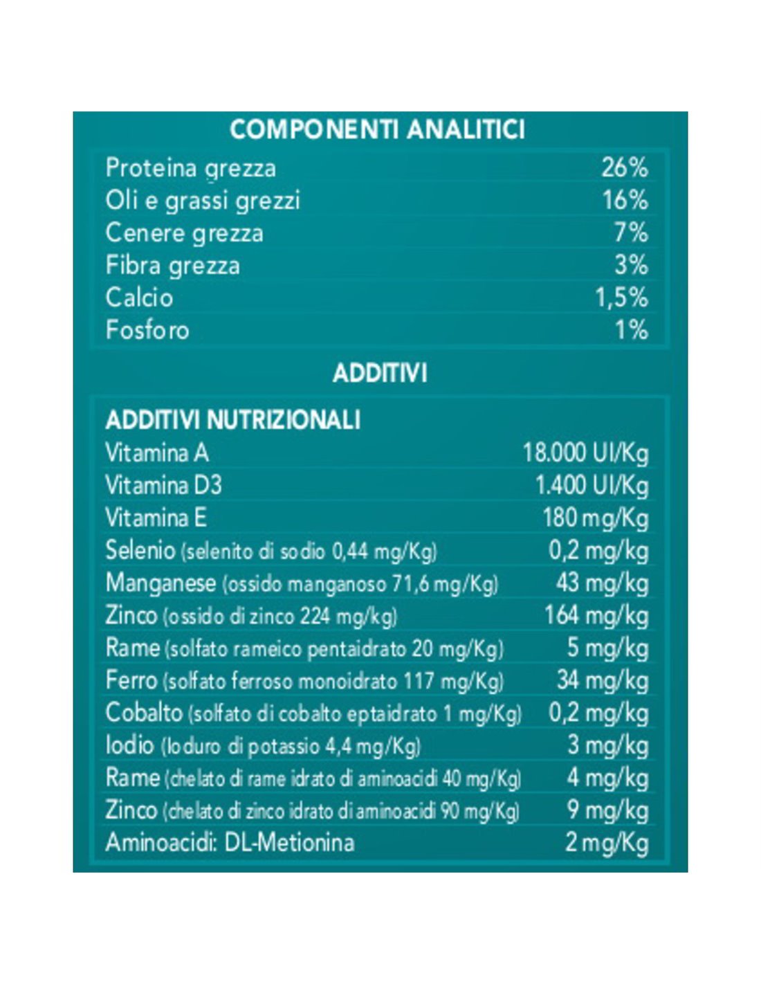 Viandes et dérivés (poulet déshydraté 18%, frais 4%), céréales (riz 7%), huiles et graisses, sous-produits d'origine végétale (pulpe de betterave 2%, FOS fructo-oligosaccharides 0,3%, levure de bière 0,3%, graines de lin 0,3%), substances minérales.