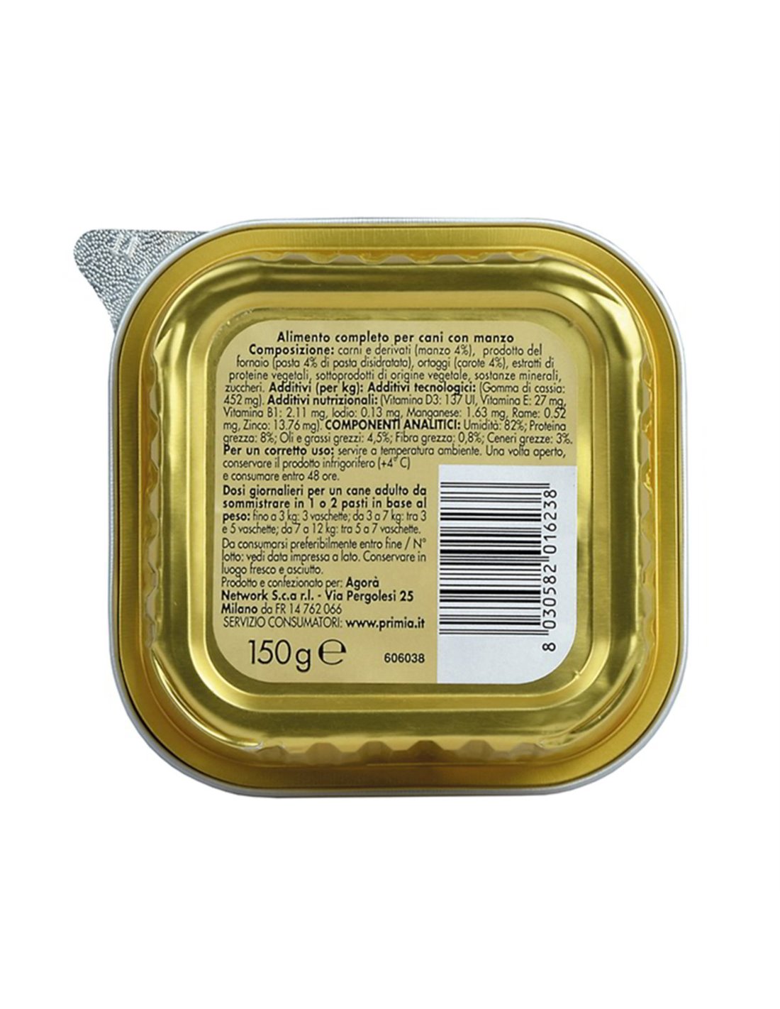 Aliment complet pour chiens avec bœuf. Composition : viandes et produits dérivés (bœuf 4%), produit de boulangerie (pâtes 4% de pâtes déshydratées), légumes (carottes 4%), extraits de protéines végétales, sous-produits d'origine végétale, substances minérales, sucres. Additifs nutritionnels : Vitamine D3 : 137 UI, Vitamine E : 27 mg, Vitamine B1 : 2,11 mg, Iode : 0,16 mg, Manganèse : 1,63 mg, Cuivre : 0,52 mg, Zinc : 13,76 mg.