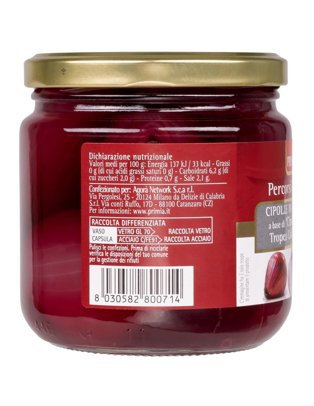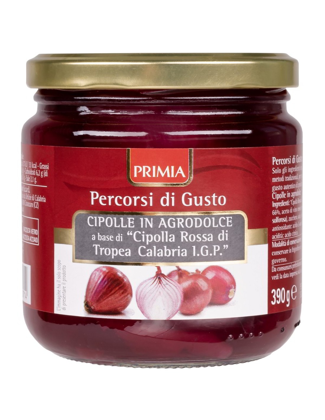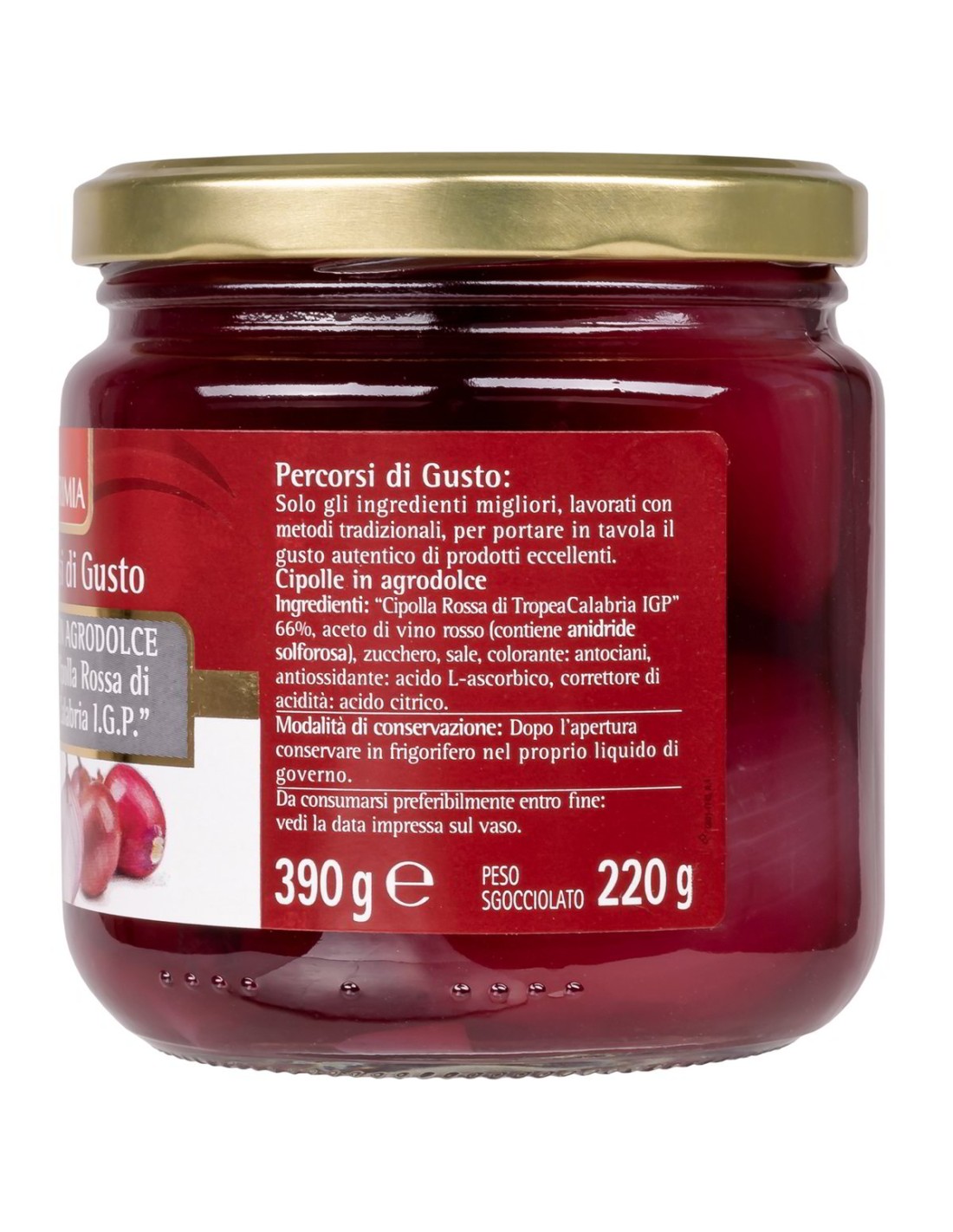 "Oignon Rouge de Tropea Calabre IGP" 66%, vinaigre de vin rouge, eau, sucre, vin rouge (sulfites), sel, correcteur d'acidité : acide citrique ; antioxydant : acide ascorbique.