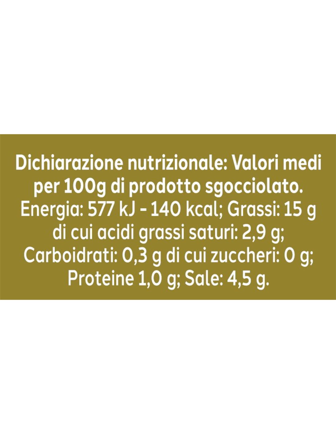 Énergie : 527 kJ / 126 kcal | Matières grasses : 12,1 g | dont Acides gras saturés : 1,5 g | Glucides : 2,1 g | dont Sucres : 0,7 g | Fibres : 2,9 g | Protéines : 0,6 g | Sel : 2,36 g