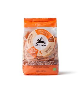 Les penne rigate complètes de blé dur et lentilles Alce Nero, de couleur cuivrée et au goût délicat, se marient parfaitement avec tous les assaisonnements et conservent une excellente tenue à la cuisson.