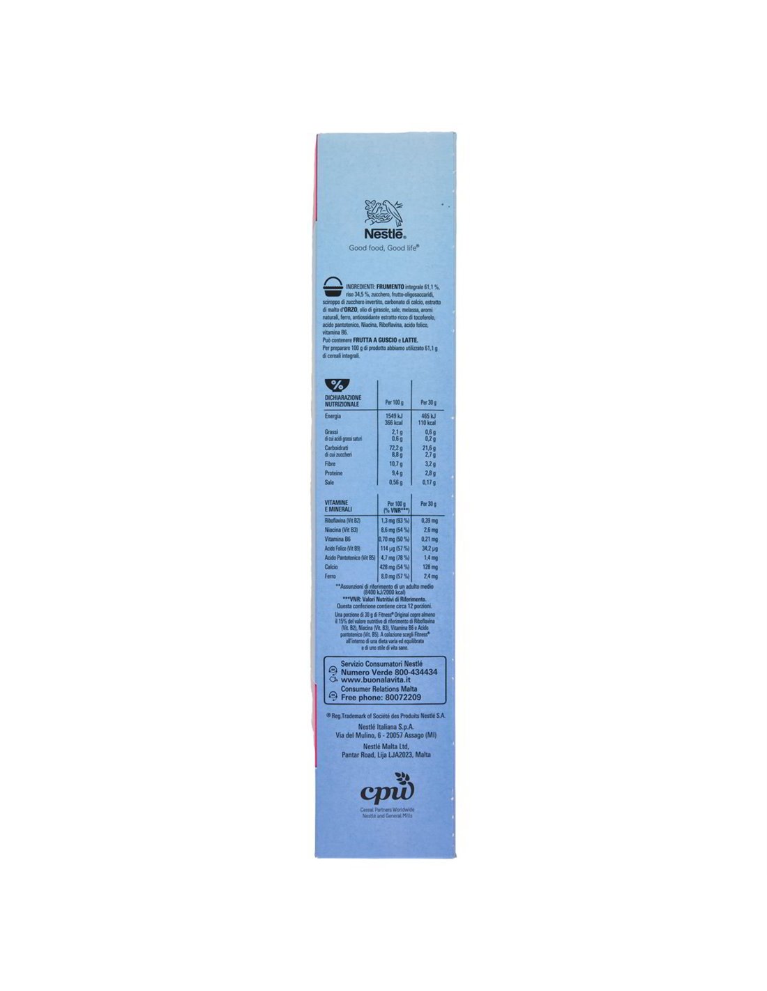 BLÉ complet 50,8%, riz 37,4%, AVOINE complète 7,1%, sucre, sirop de sucre de canne partiellement inverti, extrait de malt d'ORGE, vitamines et minéraux (carbonate de calcium, niacine, fer, acide pantothénique, vitamine B6, riboflavine, acide folique), sel, sirop de glucose, antioxydant extrait riche en tocophérols. Peut contenir des ARACHIDES, des FRUITS À COQUE, du LAIT.