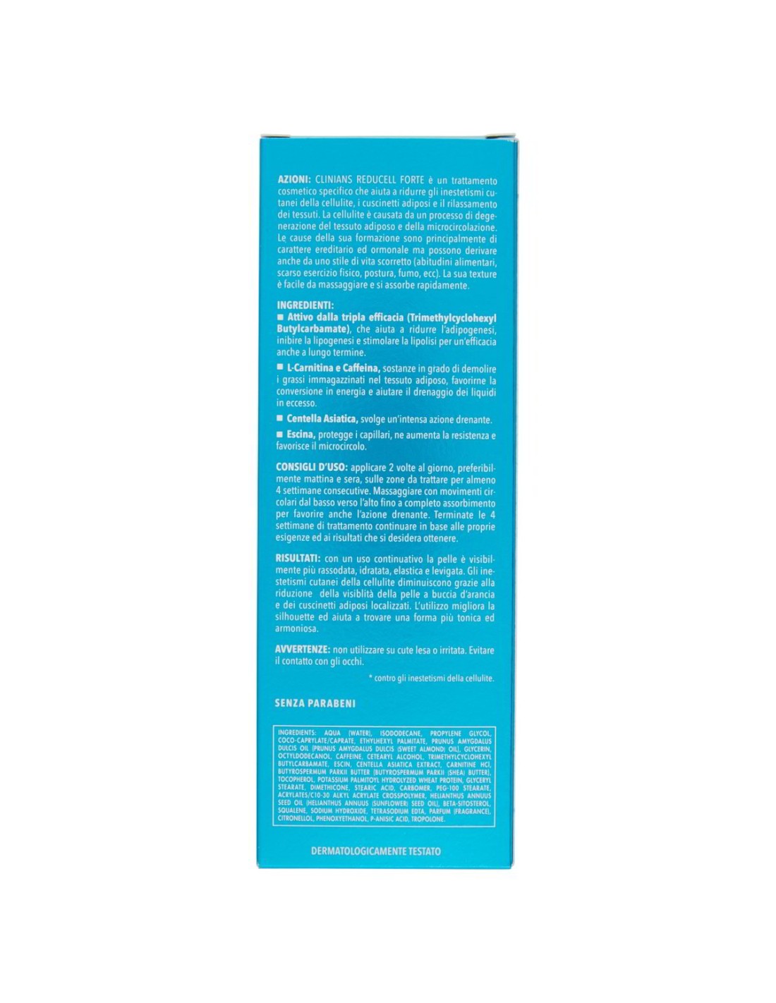 Clinians Intense A Bodycare Reducell Forte Crème Raffermissante 200 ml est un soin cosmétique ciblé qui agit sur la cellulite grâce à une triple action synergique : le Trimethylcyclohexyl Butylcarbamate (actif breveté) favorise la combustion des graisses, réduit l'absorption des lipides et ralentit la formation de nouvelles cellules adipeuses ; la Caféine démolit les graisses stockées dans le tissu adipeux, favorisant leur conversion en énergie ; l'Acide Hyaluronique maintient la peau intensément hydratée, élastique et lisse pendant tout le cycle de traitement. En association avec la Centella Asiatica, l'Huile d'Amande Douce et l'Escine vasoprotectrice, il améliore activement la microcirculation et l'aspect des tissus, réduisant la visibilité de la peau d'orange.