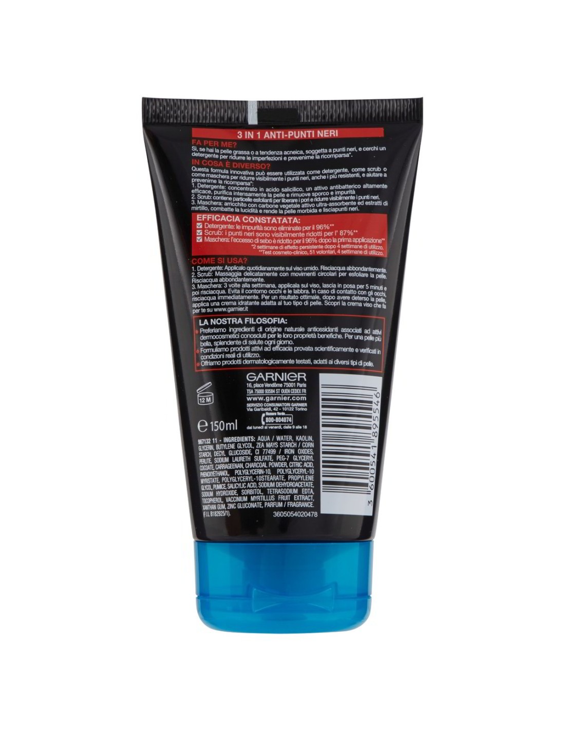 Aqua/Water, Kaolin, Glycerin, Butylene Glycol, Zea Mays Starch/Corn Starch, Decyl Glucoside, CI 77499/Iron Oxides, Perlite, Sodium Laureth Sulfate, PEG-7 Glyceryl Cocoate, Carrageenan, Charcoal Powder, Citric Acid, Phenoxyethanol, Polyglycerin-10, Polyglyceryl-10 Myristate, Polyglyceryl-10 Stearate, Propylene Glycol, Pumice, Salicylic Acid, Sodium Dehydroacetate, Sodium Hydroxide, Sorbitol, Tetrasodium EDTA, Tocopherol, Vaccinium Myrtillus Fruit Extract, Xanthan Gum, Zinc Gluconate, Parfum/Fragrance