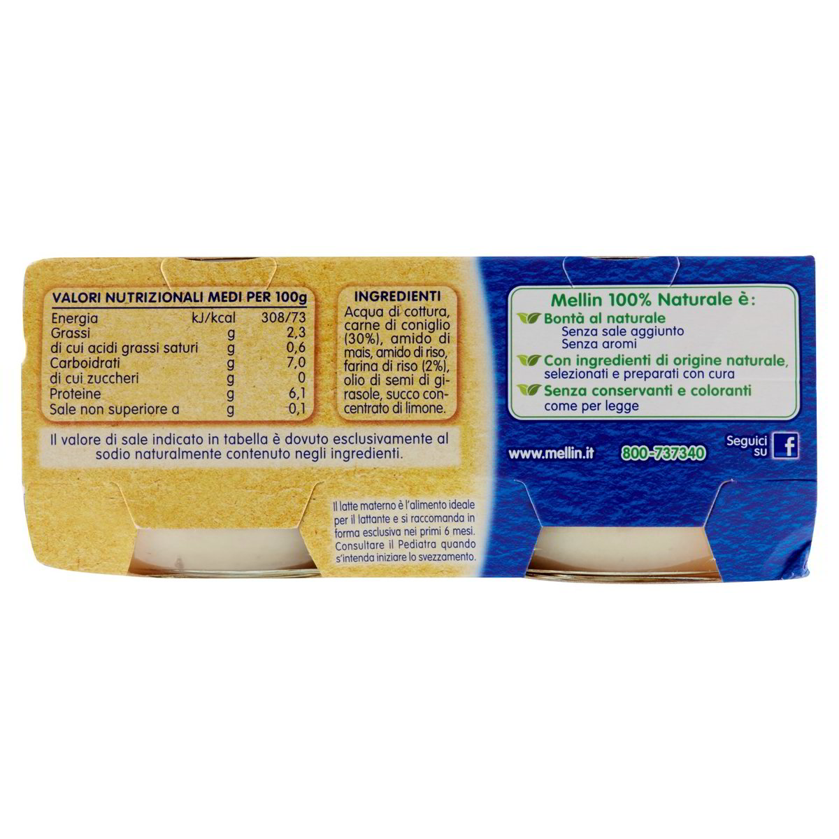 L'Omogeneizzato Mellin Coniglio e Farina di Riso è stato formulato pensando alle esigenze nutrizionali dei più piccoli, ed è indicato a partire dal 4°/6° mese compiuto, salvo diverso parere del pediatra. Questo omogeneizzato offre una combinazione delicata di carne di coniglio selezionata (25%) e farina di riso (5%), ingredienti noti per la loro leggerezza e alta digeribilità. Il coniglio è una carne bianca magra, ricca di proteine ad alto valore biologico, fondamentali per la crescita muscolare e lo sviluppo cellulare del bambino. La farina di riso aggiunge una consistenza vellutata e contribuisce a rendere il pasto più completo.