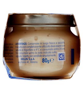 Mellin garantisce un prodotto di alta qualità grazie a una rigorosa selezione delle materie prime e una preparazione attenta. L'omogeneizzato viene cotto a vapore per preservare al meglio le proprietà nutritive degli ingredienti ed è senza glutine, senza sale aggiunto, senza coloranti e senza conservanti. È ideale da proporre come secondo piatto durante i pasti principali o aggiunto a brodi vegetali per arricchire la pappa. La sua consistenza omogenea e il sapore delicato lo rendono facilmente accettato dal bambino durante le prime esperienze di diversificazione alimentare.