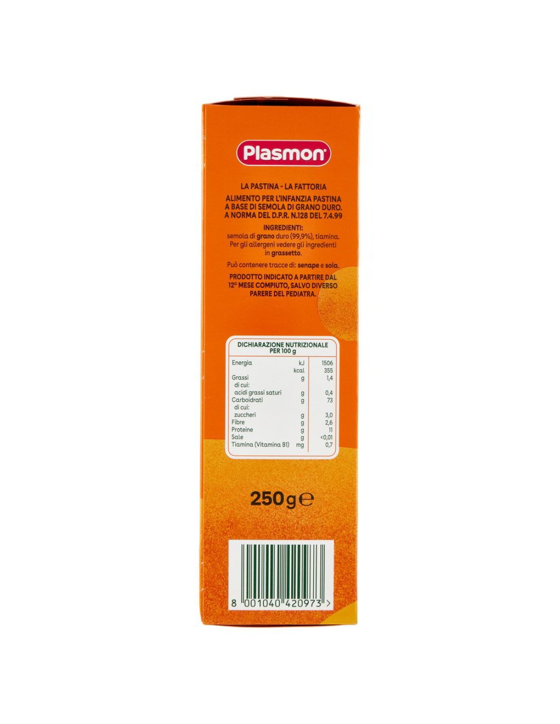 Questa pastina è un connubio perfetto tra la semola di grano duro italiana e la farina di grano tenero italiana, garantendo una consistenza che è allo stesso tempo tenera e corposa, adatta ai primi dentini. È una fonte preziosa di nutrienti essenziali per la crescita: Calcio, fondamentale per lo sviluppo di ossa e denti, Ferro, che contribuisce alla normale formazione dei globuli rossi e al trasporto dell'ossigeno, e diverse Vitamine del gruppo B (B1, B2, B3, B6), che supportano il corretto metabolismo energetico. La ricetta è semplice e trasparente, senza sale aggiunto (il contenuto di sale è dovuto esclusivamente al sodio naturalmente presente) e senza coloranti né conservanti, come previsto dalla legge. La cottura rapida, in circa 5-9 minuti a seconda del formato specifico (controllare sempre la confezione per i tempi esatti), la rende una soluzione pratica per preparare pappe complete e gustose, magari con i sughetti Plasmon.