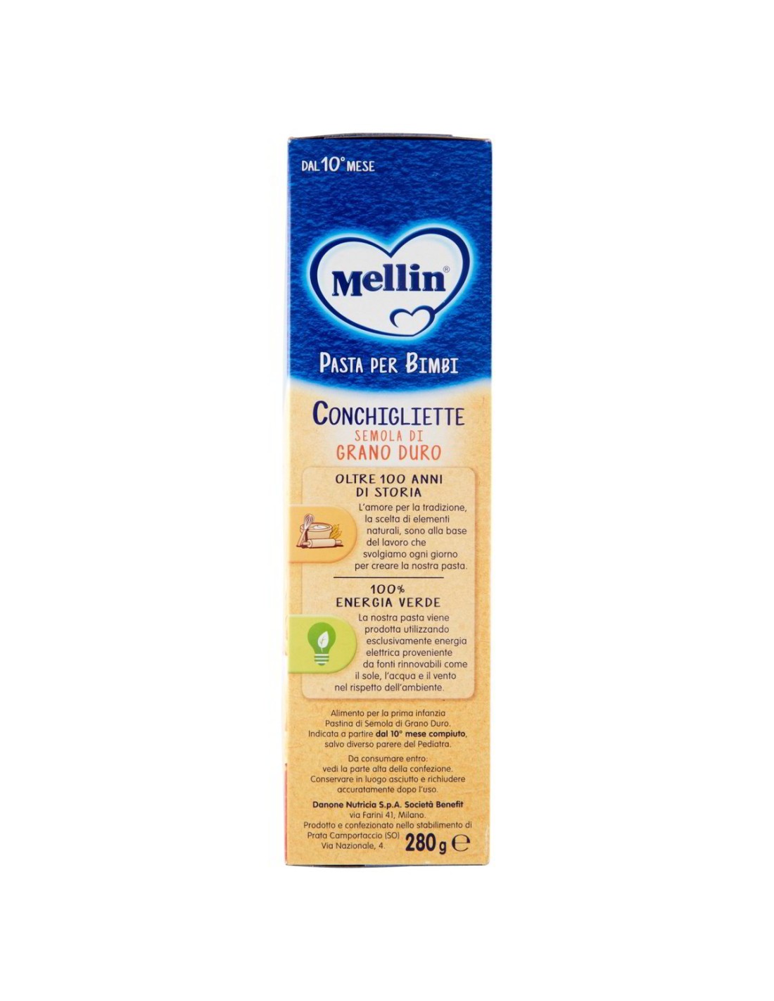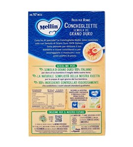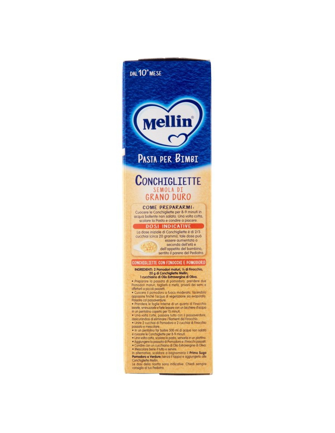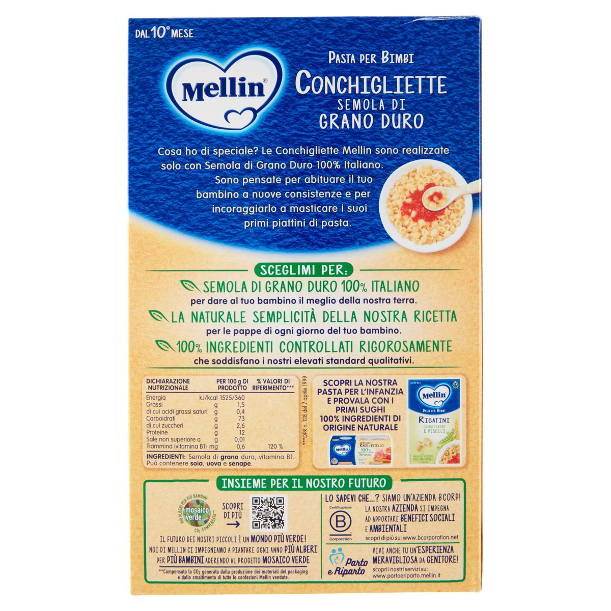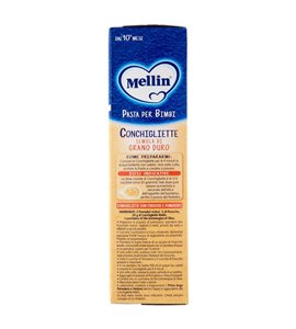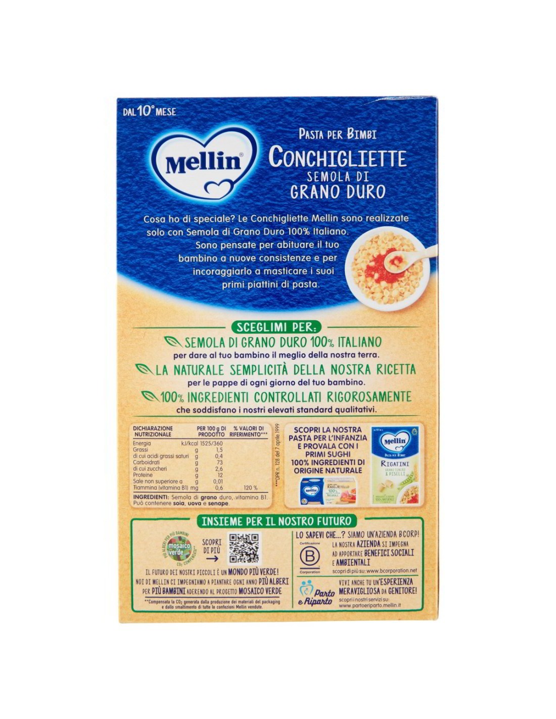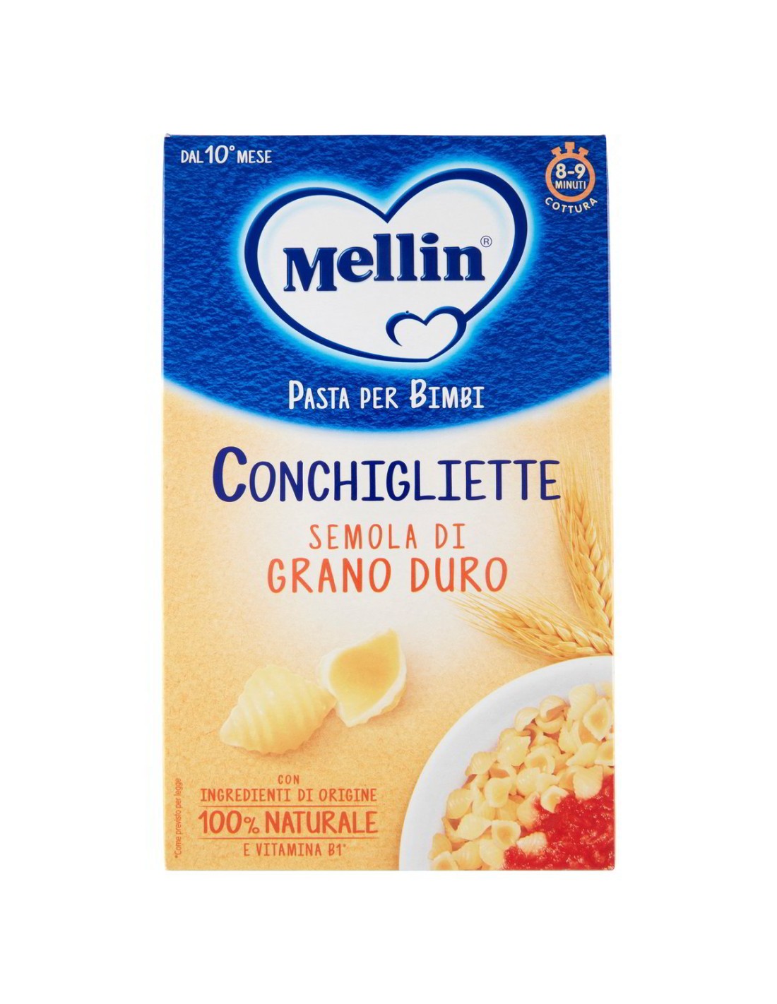 La Pasta Mellin Conchigliette è la scelta ideale per iniziare il tuo bambino alla pastina. Realizzata con grano tenero di alta qualità, è facile da masticare e digerire, perfetta per le prime pappe.