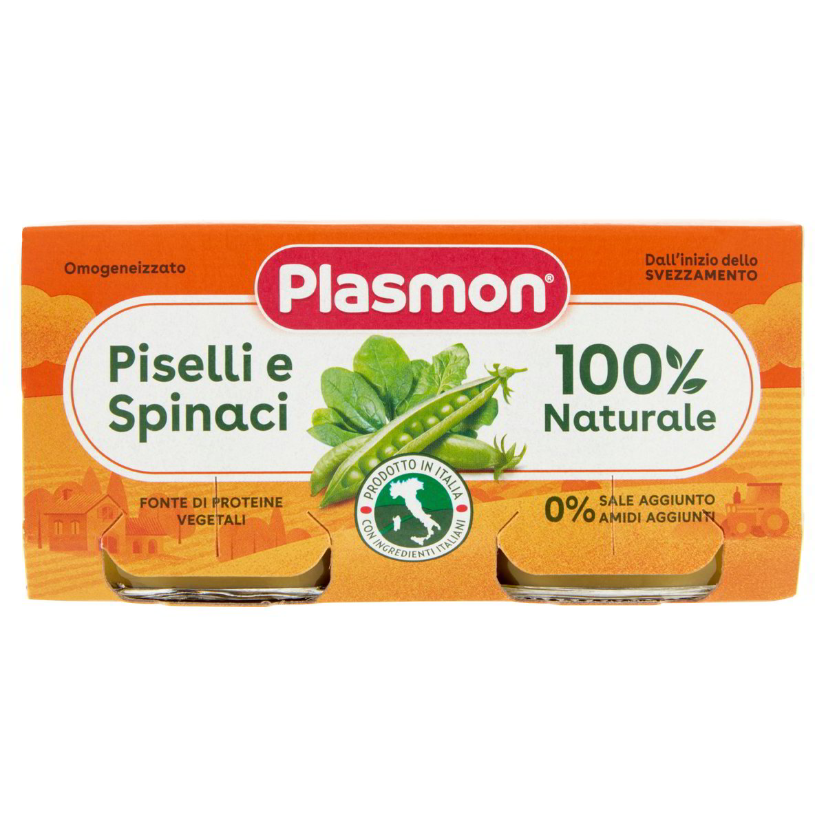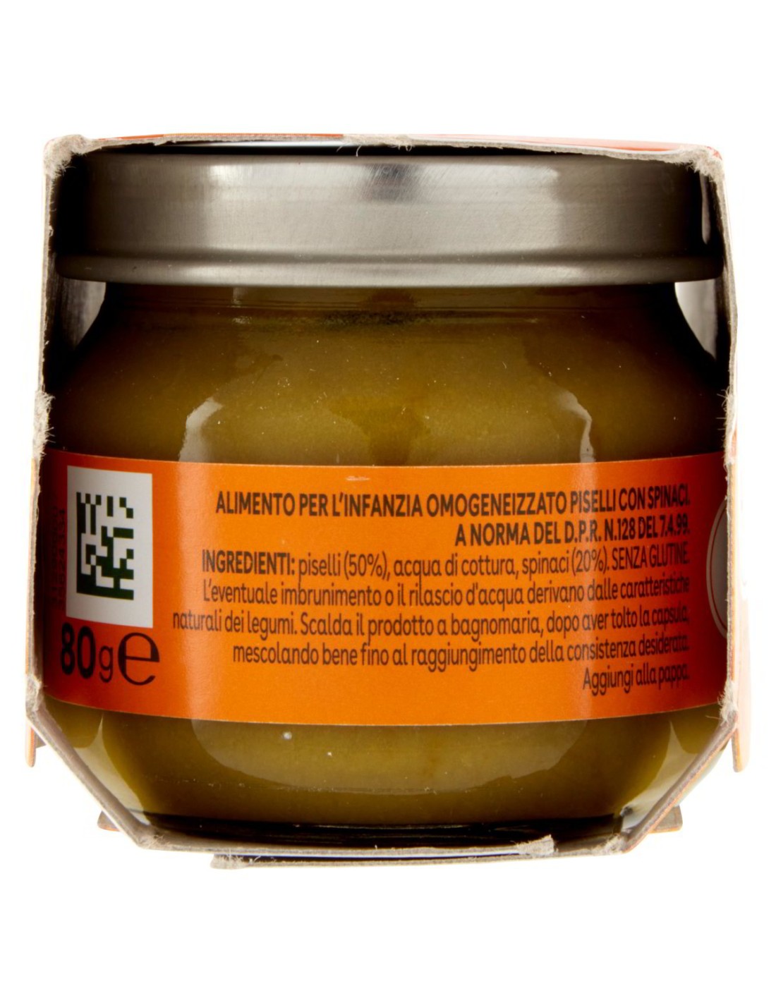 Ingredienti: Piselli (50%), acqua di cottura, spinaci (20%). Senza glutine.