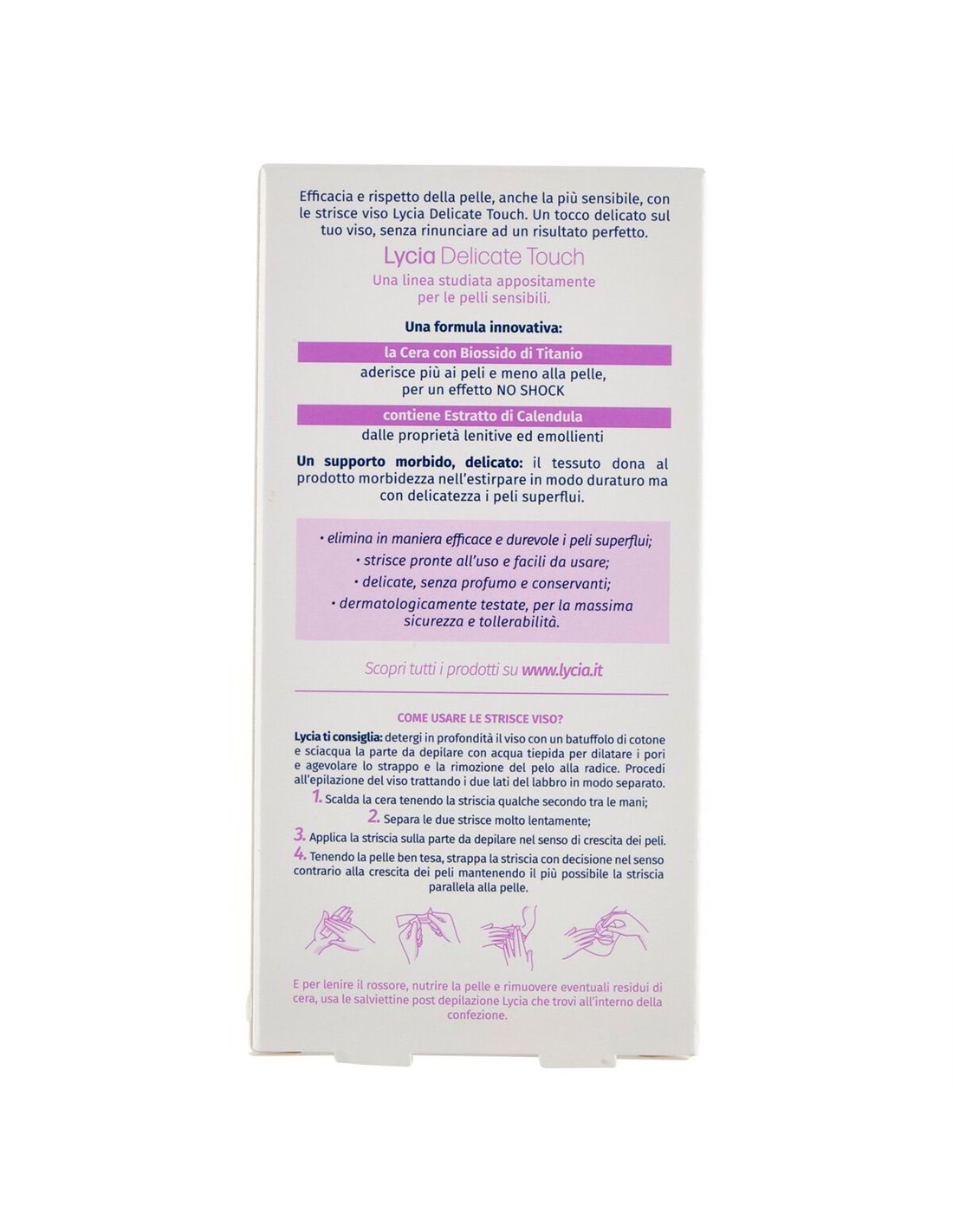 🔥 Da oltre quarant'anni Lycia accompagna le donne con prodotti pensati per valorizzare la loro pelle, combinando ricerca continua e Made in Italy di qualità. Le Strisce Depilatorie Delicate Touch Viso rappresentano l'espressione più alta di questa filosofia: una linea nata per chi ha la pelle sensibile e non vuole compromessi tra efficacia e delicatezza.