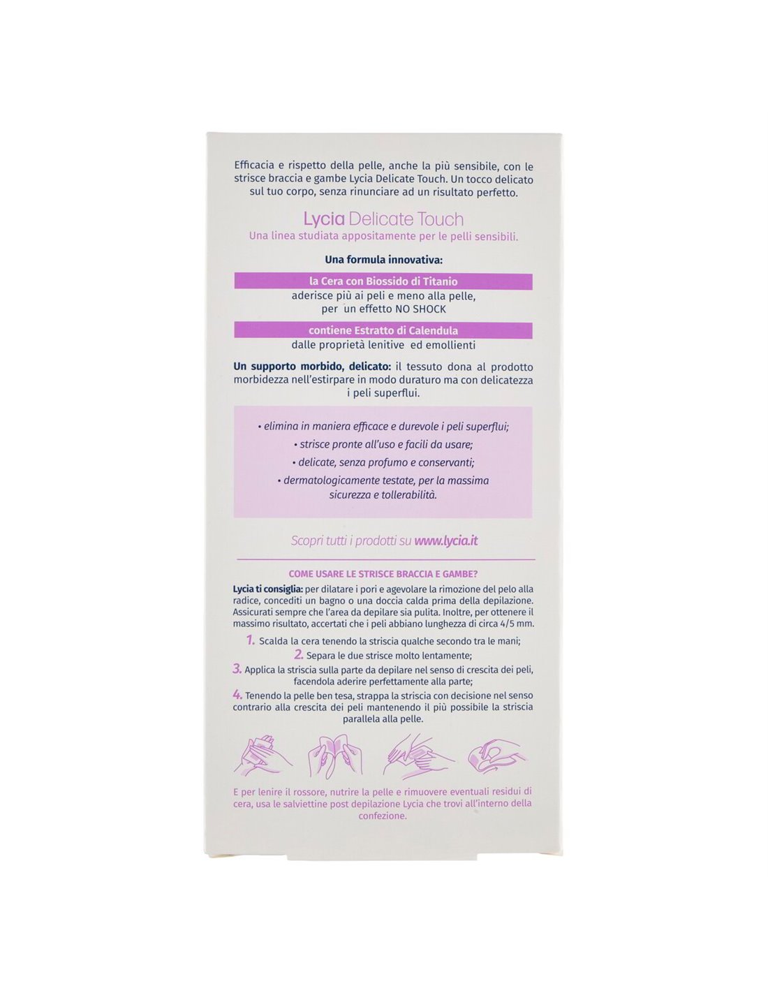 🌸 Prenditi cura delle zone più estese del tuo corpo con la stessa attenzione che riservi al viso. Le Lycia Delicate Touch Strisce Depilatorie Braccia & Gambe nascono da una ricerca dedicata esclusivamente alle pelli sensibili, con l'obiettivo di garantire un risultato professionale a casa tua, senza rossori, senza fastidi, senza compromessi.