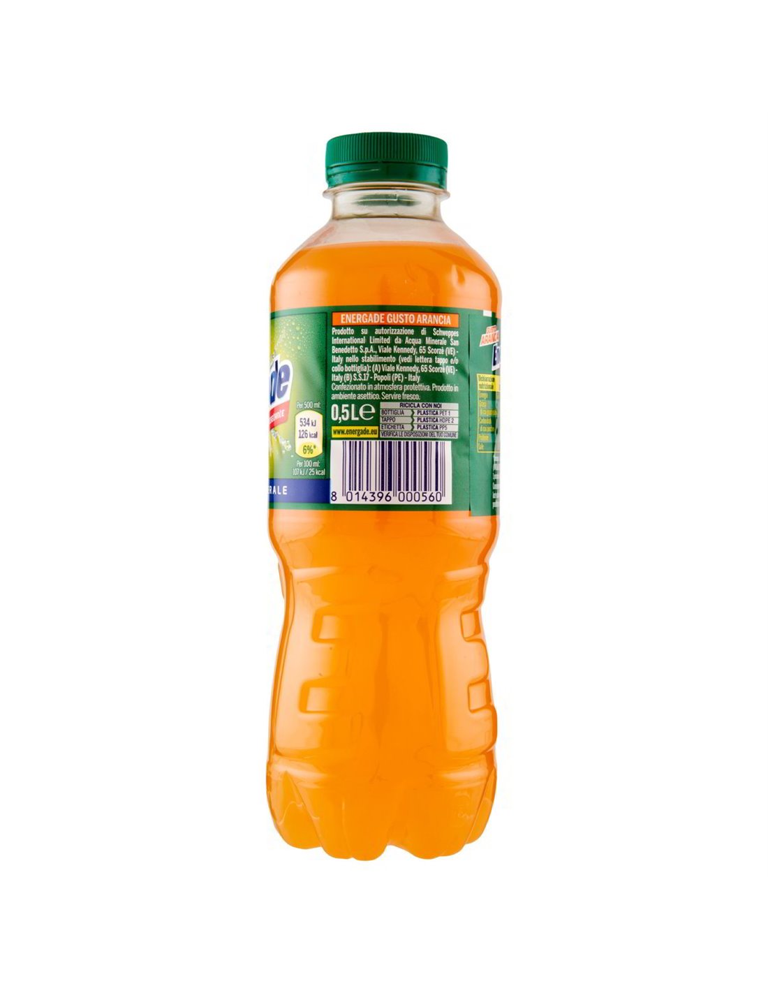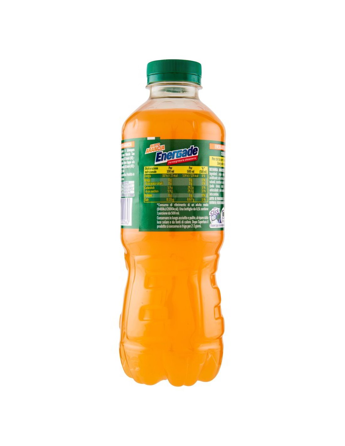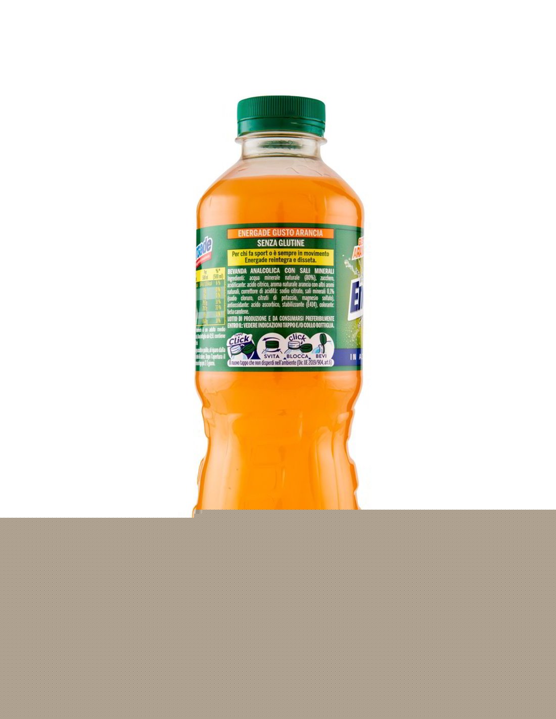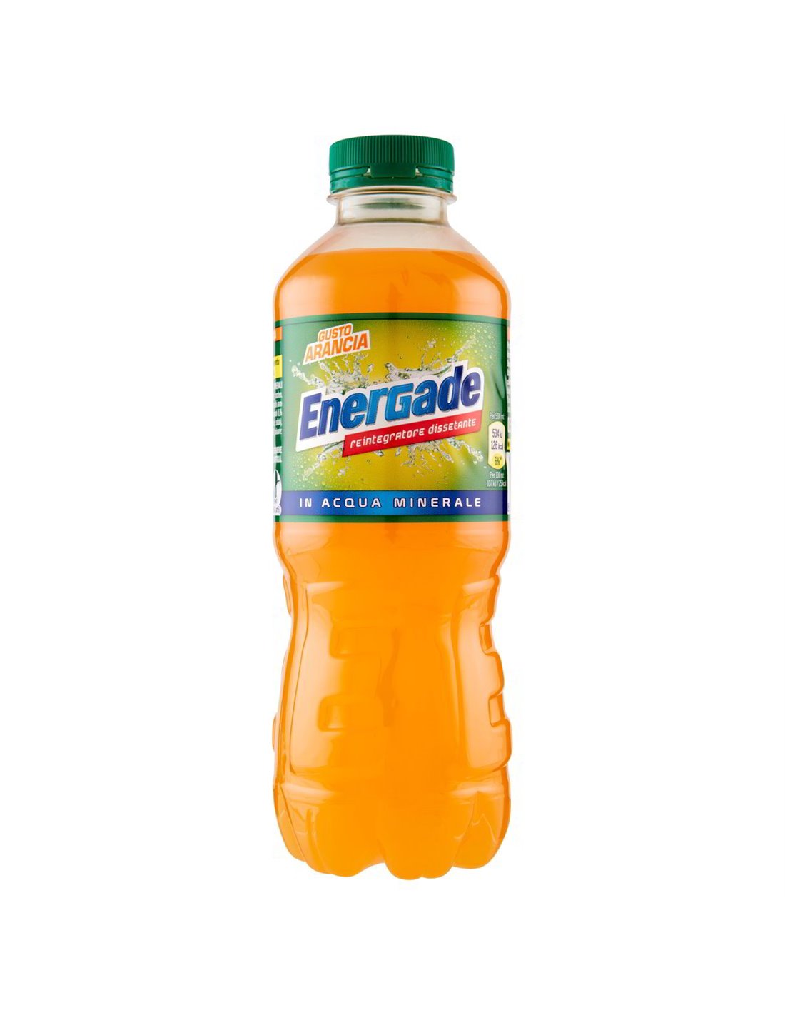 Ingredienti: Acqua minerale naturale (80%), Zucchero, Acidificante: acido citrico, Destrosio, Aroma naturale arancia con altri aromi naturali, Sali minerali 0,1% (sodio cloruro, potassio fosfato monobasico, magnesio solfato), Correttore di acidità: sodio citrato, Antiossidante: acido ascorbico, Stabilizzanti (E1450, E414), Colorante: beta carotene.