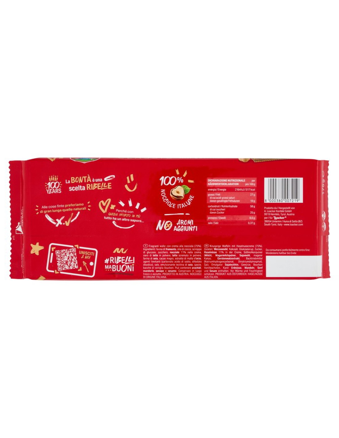Può contenere arachidi, mandorle, senape e sesamo. Conservare in luogo fresco e asciutto (4°–22°C). Prodotto da A. Loacker Konfekt GmbH, 9919 Heinfels, Tyrol, Austria per Loacker®, 39054 Unterinn/Auna di Sotto (BZ), Italy.