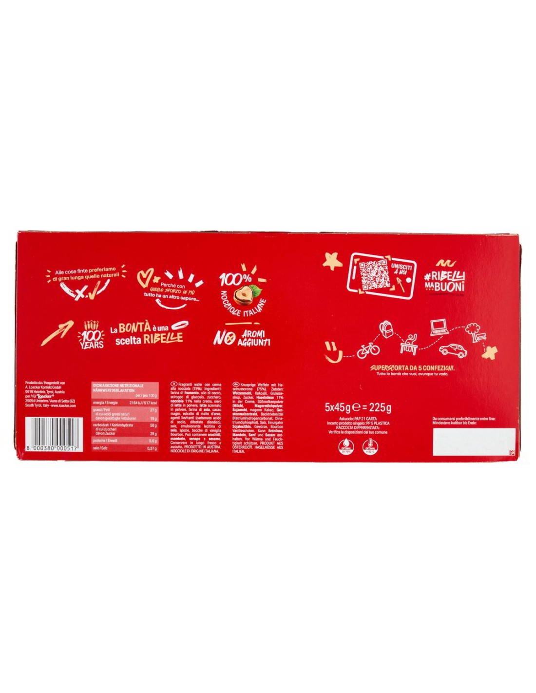Può contenere arachidi, mandorle, senape e sesamo. Conservare in luogo fresco e asciutto (4°–22°C). Prodotto da A. Loacker Konfekt GmbH, 9919 Heinfels, Tyrol, Austria per Loacker®, 39054 Unterinn/Auna di Sotto (BZ), Italy.