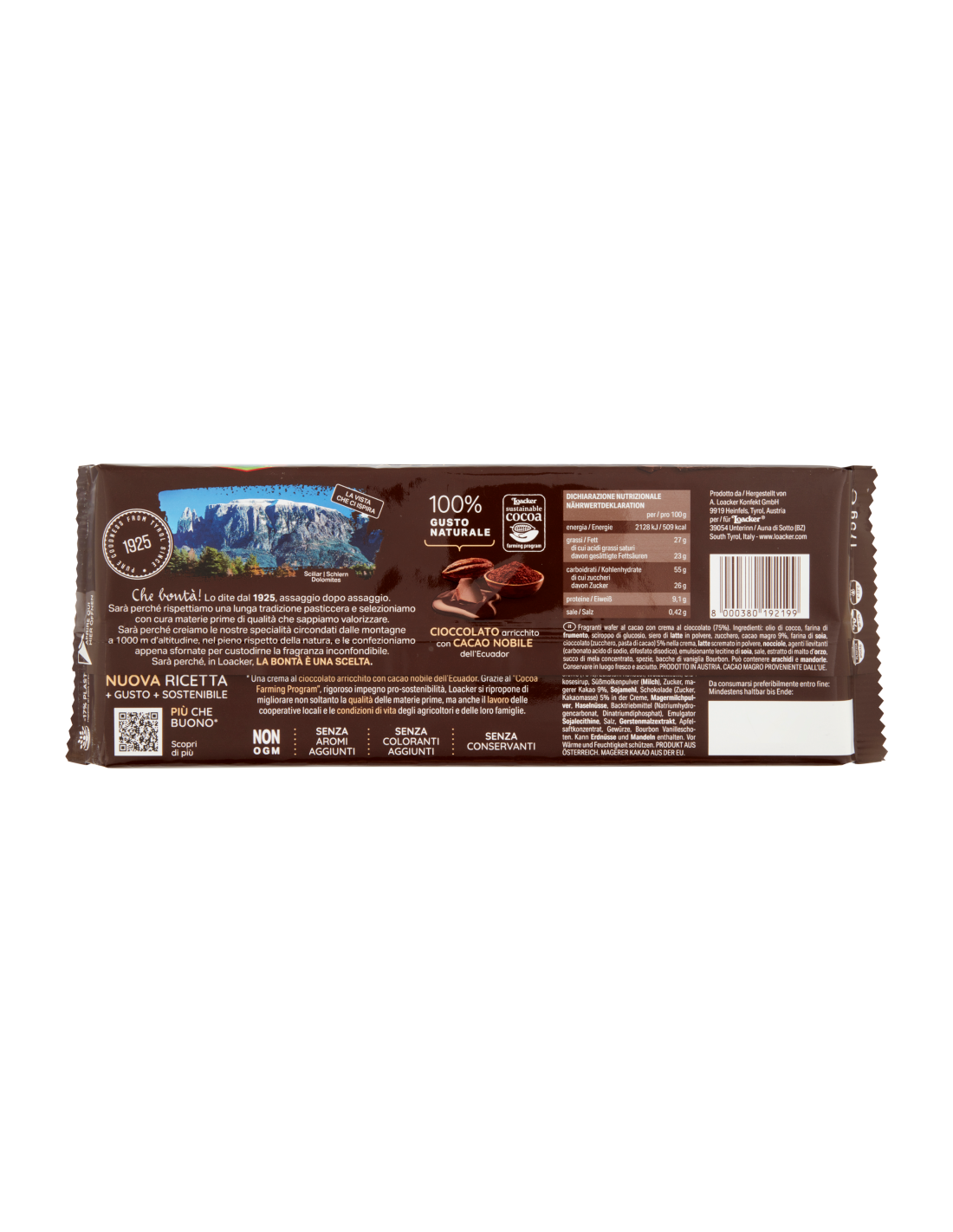 🔥 Il cacao utilizzato è magro al 9% nelle cialde, mentre nella crema è presente cioccolato vero al 5%, proveniente dal programma di coltivazione sostenibile Loacker nell'UE. Un impegno che si sente nel sapore autentico, intenso ma mai eccessivo — quello di un cioccolato selezionato con cura e rispetto per l'ambiente.