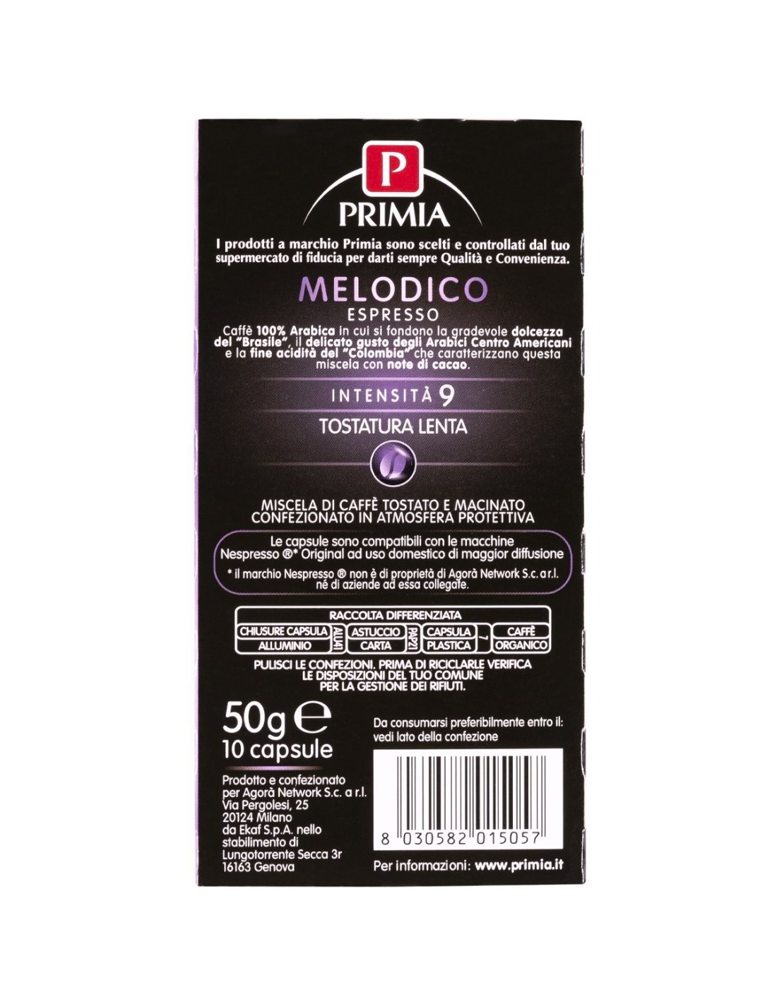 Con un'intensità valutata 9, l'Espresso Melodico Primia è pensato per chi desidera un caffè con carattere, ma senza rinunciare all'equilibrio. La sua corposità vellutata accarezza il palato, mentre l'aroma avvolgente stimola i sensi. Ogni capsula è un invito a concedersi un momento di puro piacere, sia al mattino per iniziare la giornata con brio, sia durante una pausa per ricaricarsi. La miscela di caffè tostato e macinato è accuratamente confezionata in atmosfera protettiva, garantendo che ogni capsula mantenga inalterata la sua freschezza e il suo bouquet aromatico, fino al momento dell'erogazione. 🌿