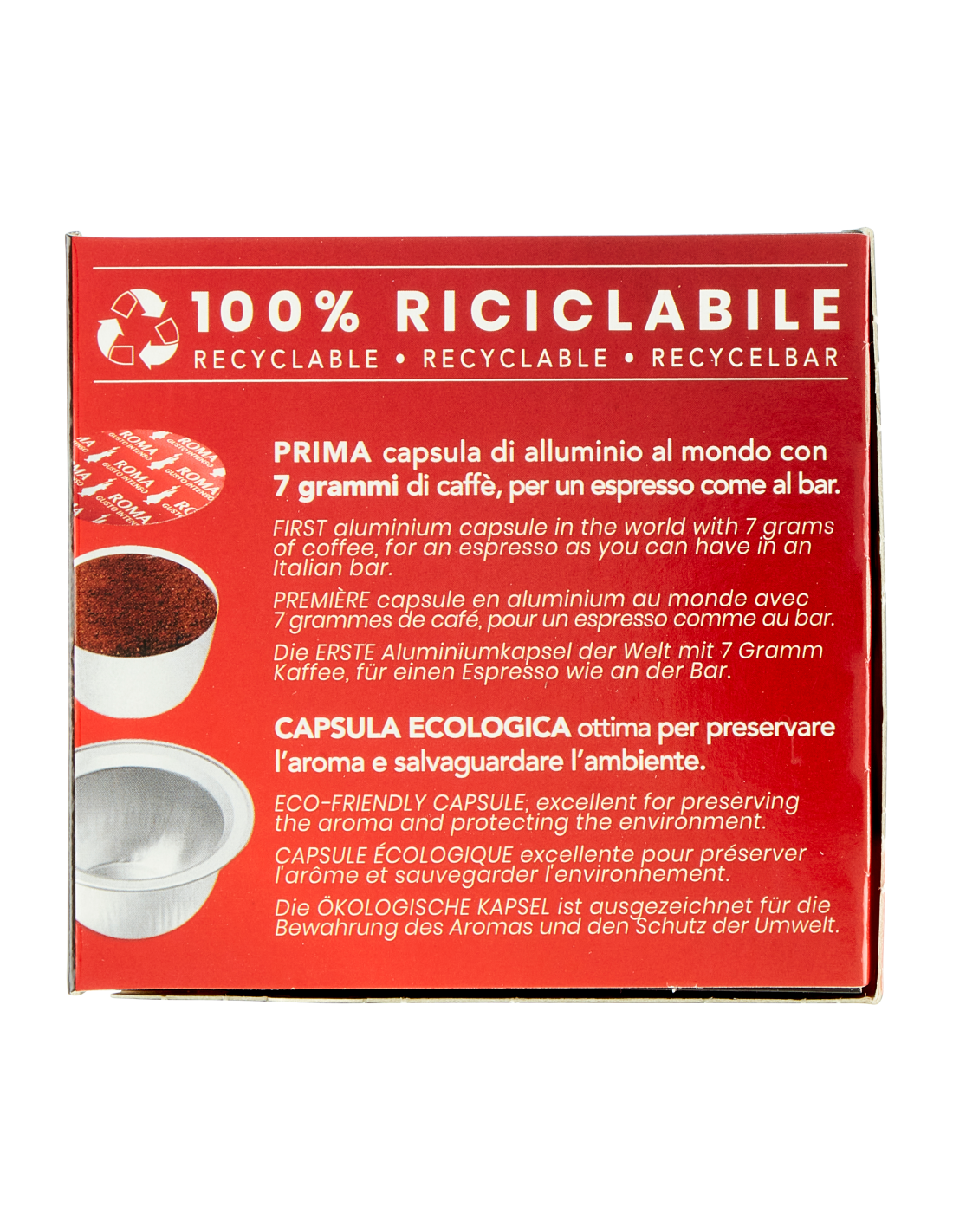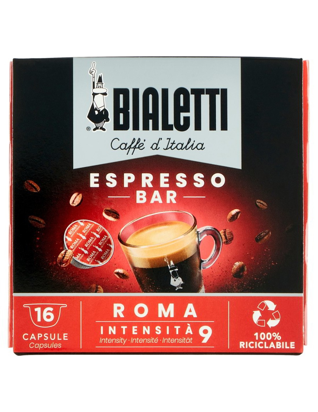 Bialetti Roma Capsule Caffè sono monodosi 50% Arabica 50% Robusta dal gusto forte e strutturato. Intensità 10 robusta, perfette per moka Bialetti. Confezione 16 capsule alluminio sigillate per aroma potente.