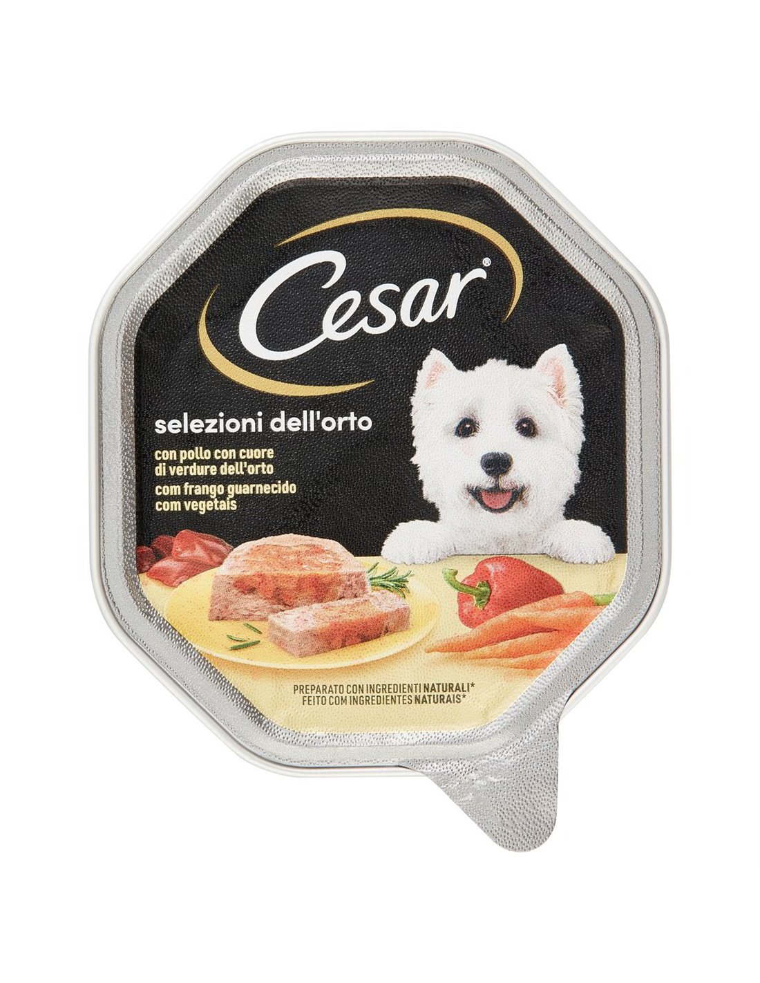 Cesar Selezioni dell’Orto Paté Pollo con Cuore di Verdure 150 g: paté delicato con ripieno vegetale, ideale come pasto completo per cani di piccola taglia. Disponibile su lowprice.ch