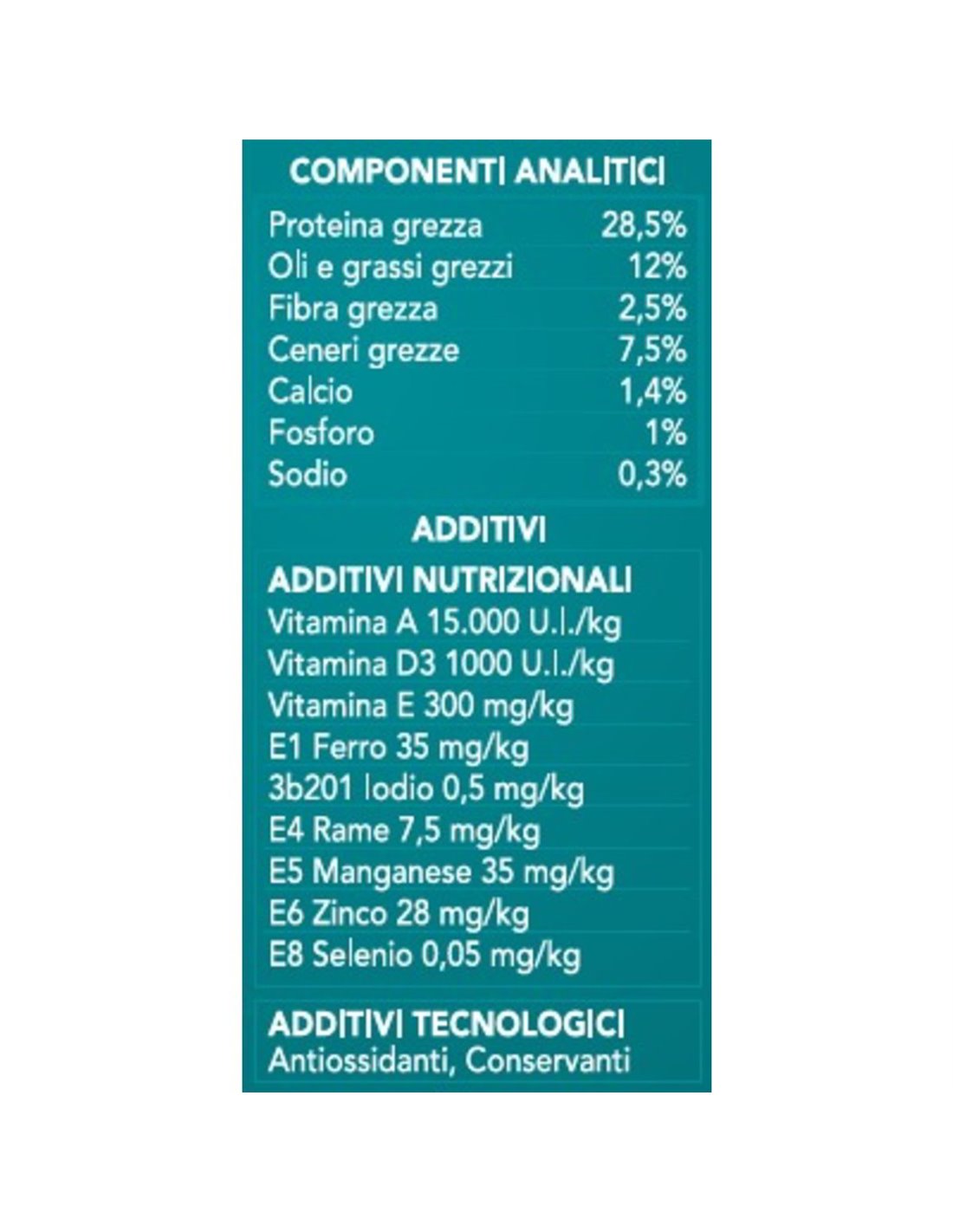 Cereali, carni e derivati (min. 20% pollo e tacchino freschi min. 4%), sottoprodotti di origine vegetale, oli e grassi, semi (semi integrale di lino 1%), estratti di proteine vegetali, lievito di birra, sostanze minerali. SENZA COLORANTI.