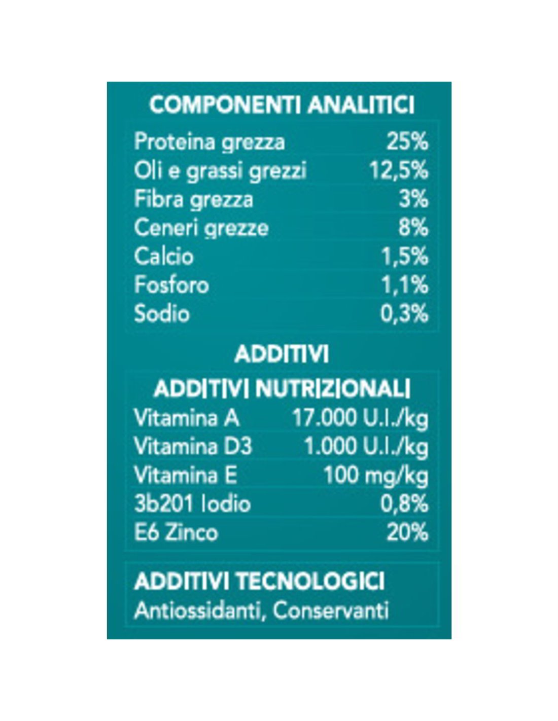 Composizione: Cereali, Carni e derivati (min. 20%, pollo fresco min. 7%), sottoprodotti di origine vegetale, oli e grassi, sostanze minerali, estratto di lievito, semi di lino (0,3%), sostanze minerali, NO ZUCCHERI AGGIUNTI, SENZA COLORANTI.