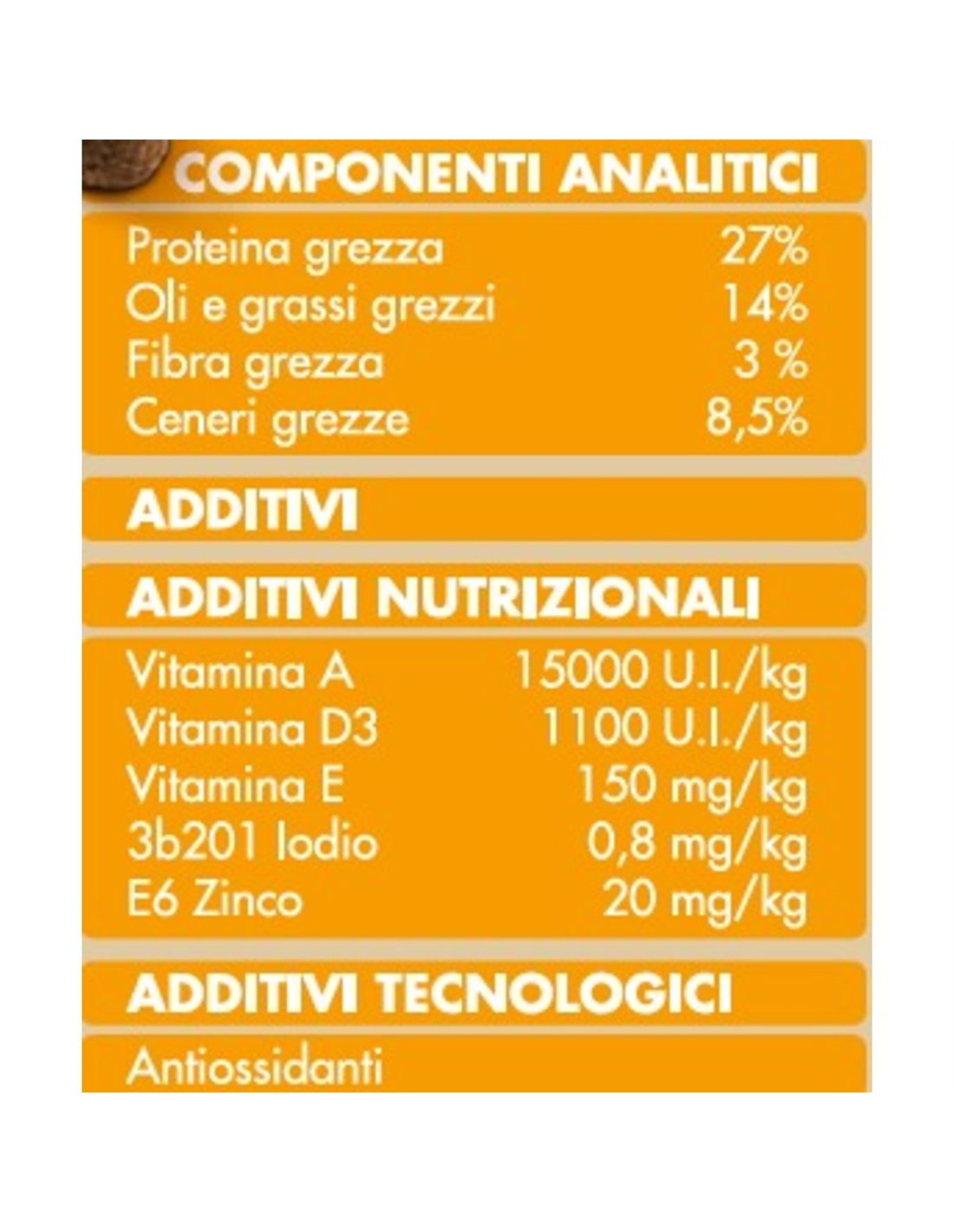 Composizione: Cereali, carni e derivati (carni min. 14% di cui pollo min. 5%), sottoprodotti di origine vegetale (semi di lino min. 0,4% fonte di Omega 3), oli e grassi, sostanze minerali, lieviti. Senza ZUCCHERI AGGIUNTI. Senza COLORANTI.