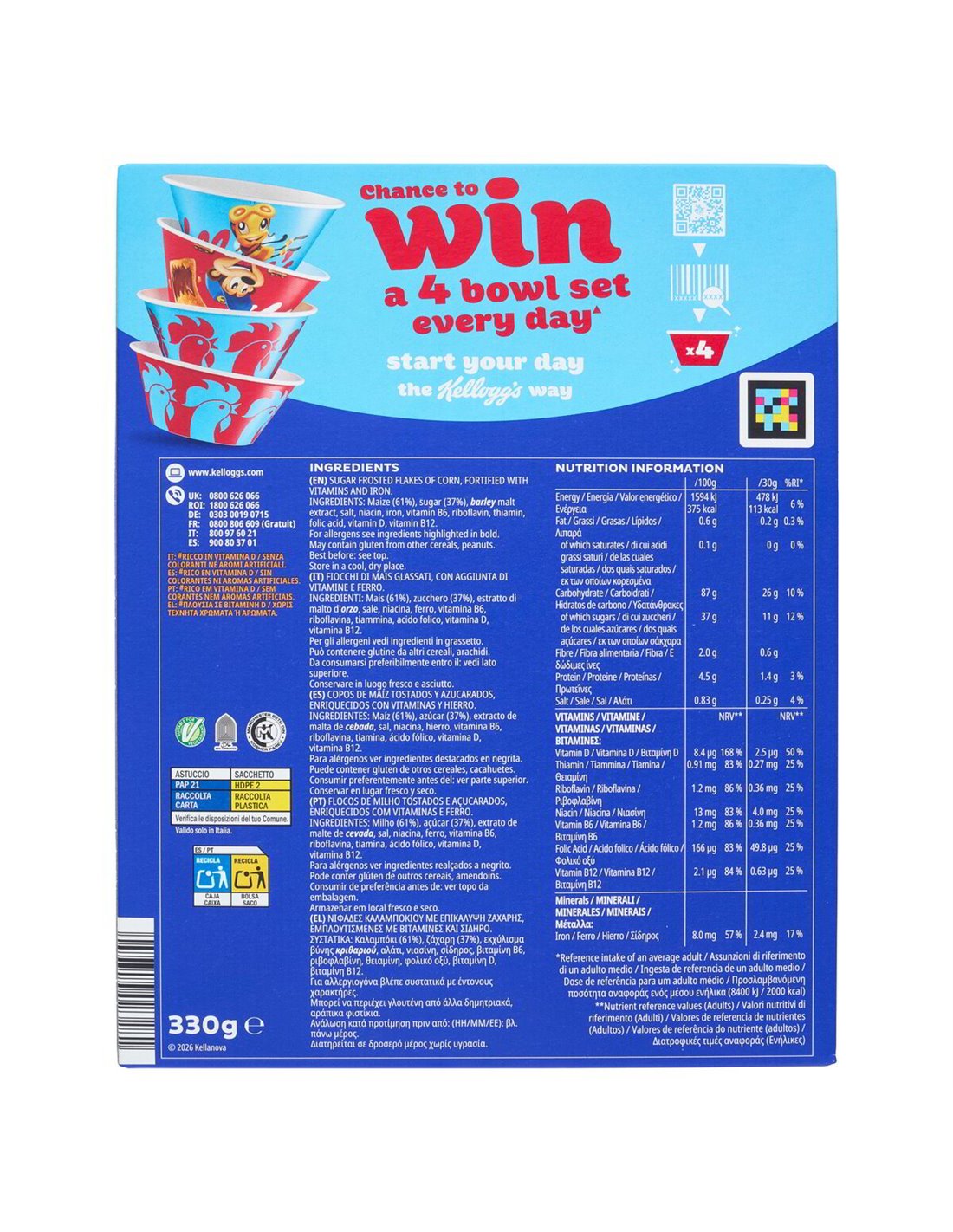 🍳 La ricetta è quella che conosci e ami: mais (61%) lavorato in sottili fiocchi croccanti, poi glassati con zucchero (37%) e arricchiti con estratto di malto d'orzo. Nessun colorante, nessun aroma artificiale. Il gusto che senti è quello autentico del mais, reso irresistibile dalla glassa e valorizzato da un mix di vitamine e minerali aggiunti.