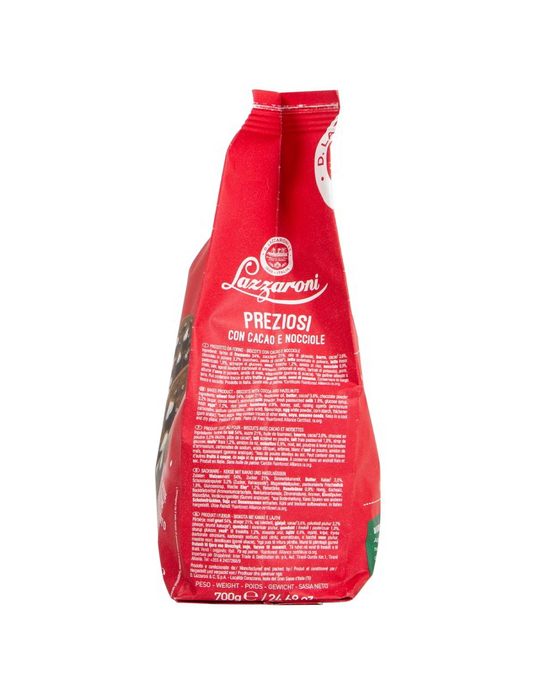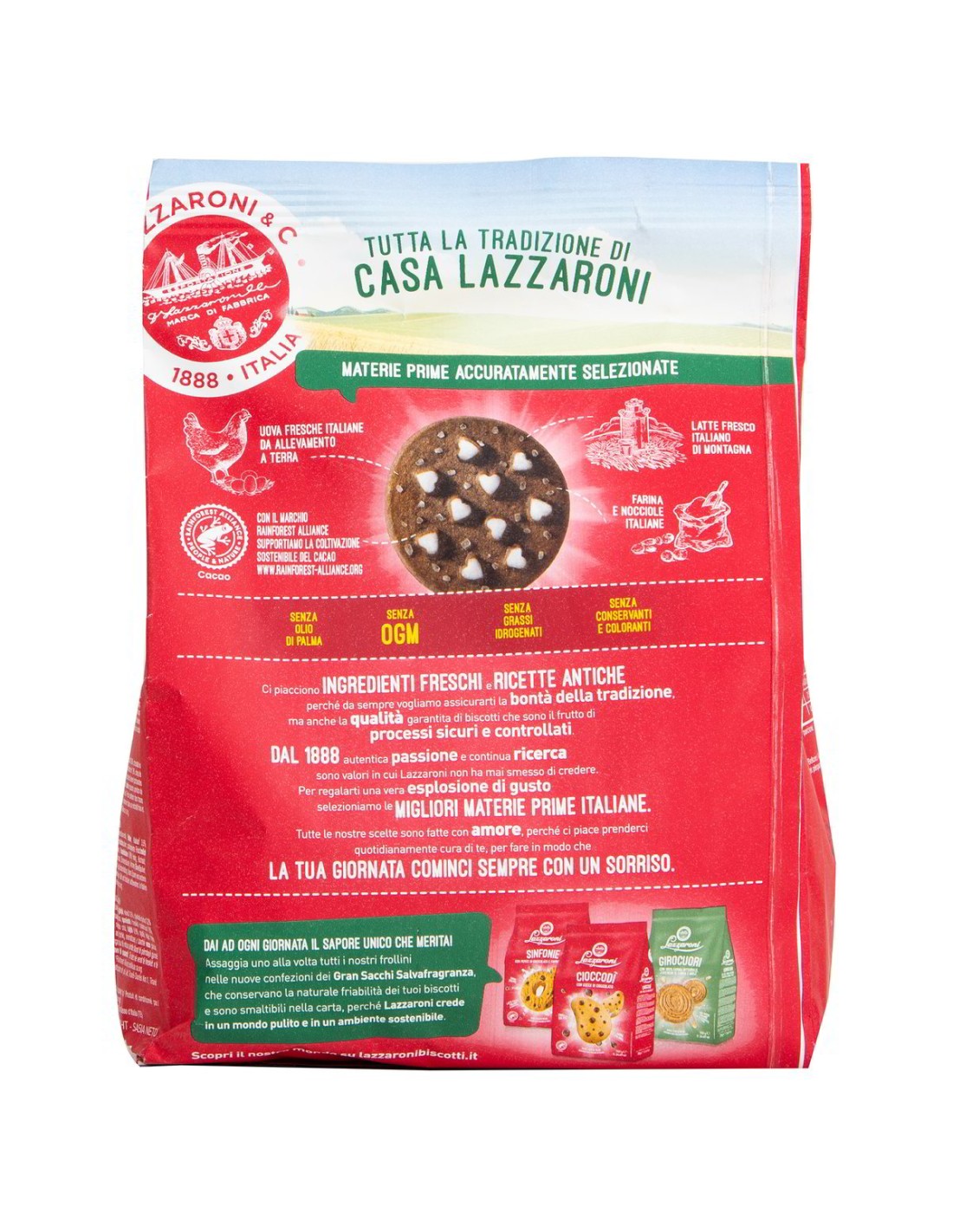Un biscotto golosissimo con cacao e nocciole, ideale da inzuppare nel latte a colazione. Rigorosamente senza olio di palma per garantire tutta la qualità Lazzaroni.