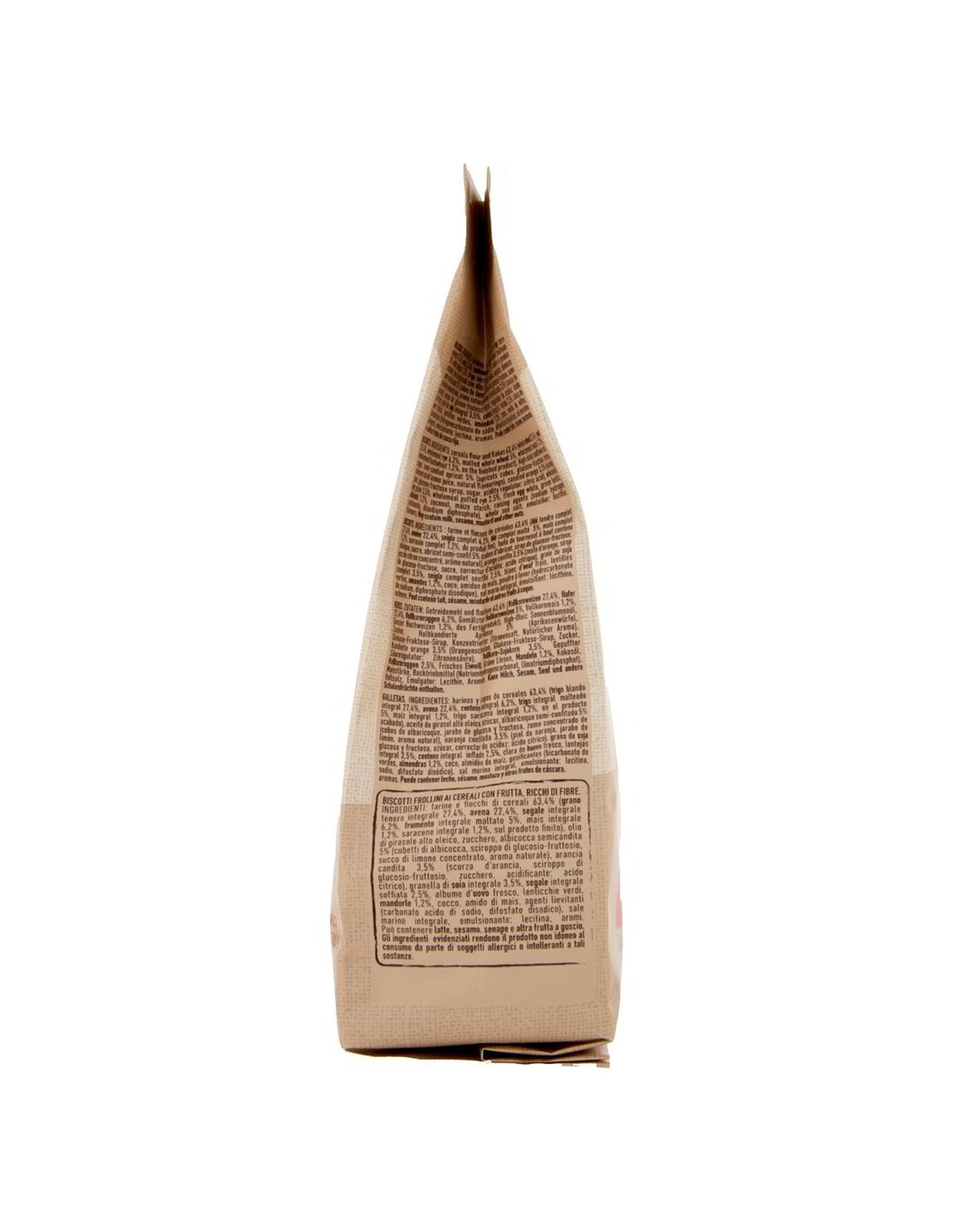 Ingredienti: Farine e fiocchi di cereali 63,4% (grano tenero integrale 27,4%, avena 22,4%, segale integrale 6,2%, frumento integrale maltato 5%, mais integrale 1,2%, saraceno integrale 1,2%, sul prodotto finito), Olio di girasole alto oleico, Zucchero, Albicocca semicandita 5% (cubetti di albicocca, sciroppo di glucosio-fruttosio, succo di limone concentrato, aroma naturale), Arancia candita 3,5% (scorza d'arancia, sciroppo di glucosio-fruttosio, zucchero, acidificante: acido citrico), Granella di soia integrale 3,5%, Segale integrale soffiata 2,5%, Albume d'uovo fresco, Lenticchie verdi, Mandorle 1,2%, Cocco, Amido di mais, Agenti lievitanti (carbonato acido di sodio, difosfato disodico), Sale marino integrale, Emulsionante: lecitina, Aromi. Può contenere latte, sesamo, senape e altra frutta a guscio.