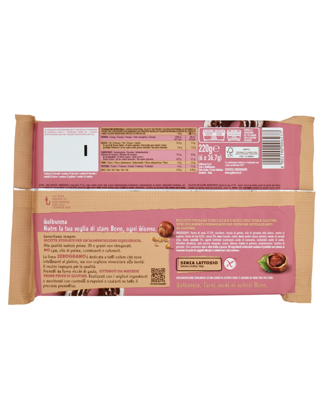 Ingredienti: Farina di mais 27,5%, zucchero, fecola di patate, olio di girasole alto oleico, amido di tapioca, farina di riso 8,5%, cacao 5%, uova fresche, miele, burro anidro senza lattosio, amido di cereali (riso, mais), nocciole 1%, agenti lievitanti (carbonato acido di ammonio, carbonato acido di sodio, difosfato disodico), sale marino integrale, aromi, albume d'uovo in polvere, emulsionante: lecitina di girasole. Può contenere soia e altra frutta a guscio.
