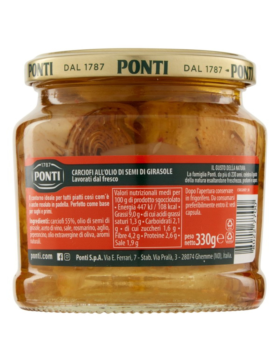 Quando nel 1787 la famiglia Ponti iniziò la sua avventura nel mondo della conservazione degli ortaggi, aveva già capito tutto: la qualità della materia prima è tutto. I Carcioghiotto Peperlizia sono la prova vivente di quella filosofia. Carciofi selezionati, lavorati direttamente dal fresco, conservati in un equilibrio perfetto di olio di semi di girasole, aceto di vino e aromi naturali che ne esaltano il carattere senza coprirne il sapore.