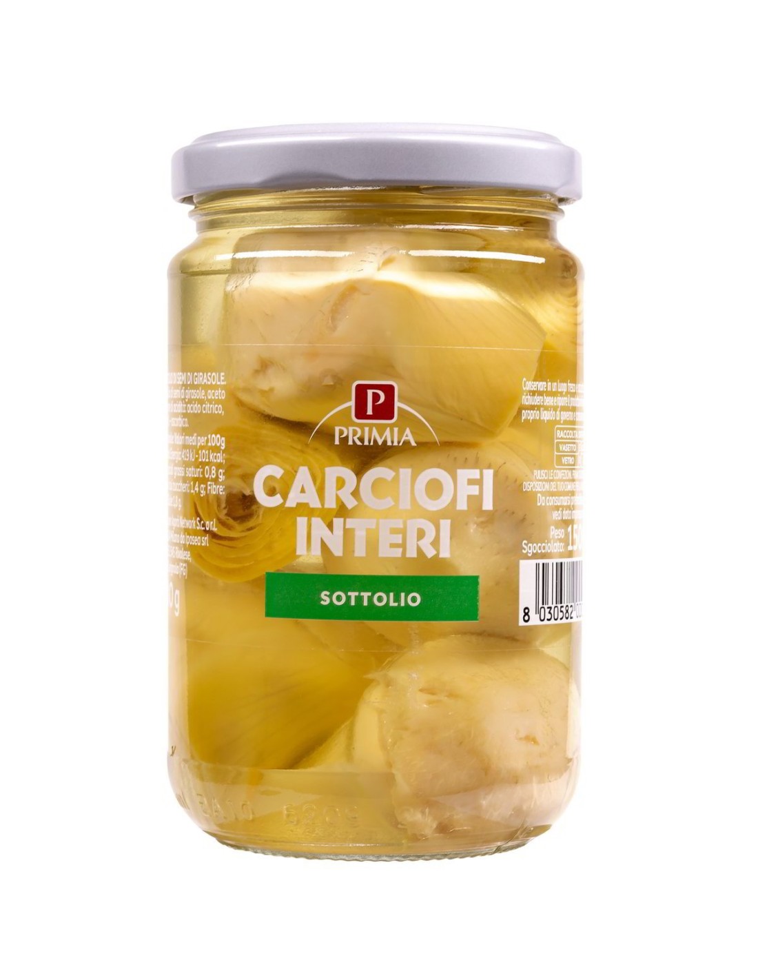 I carciofi interi Primia sono perfetti come antipasto veloce con un filo d'olio extravergine e qualche scaglia di grana. Si prestano a condire una pizza bianca fatta in casa, ad arricchire un primo piatto freddo di riso integrale con tonno e pomodorini, oppure ad accompagnare carni bianche arrosto come contorno saporito. Ideali per chi cerca un contorno pronto in tavola in meno di due minuti, o per chi vuole portare un tocco di gusto italiano anche in un pranzo fuori casa.