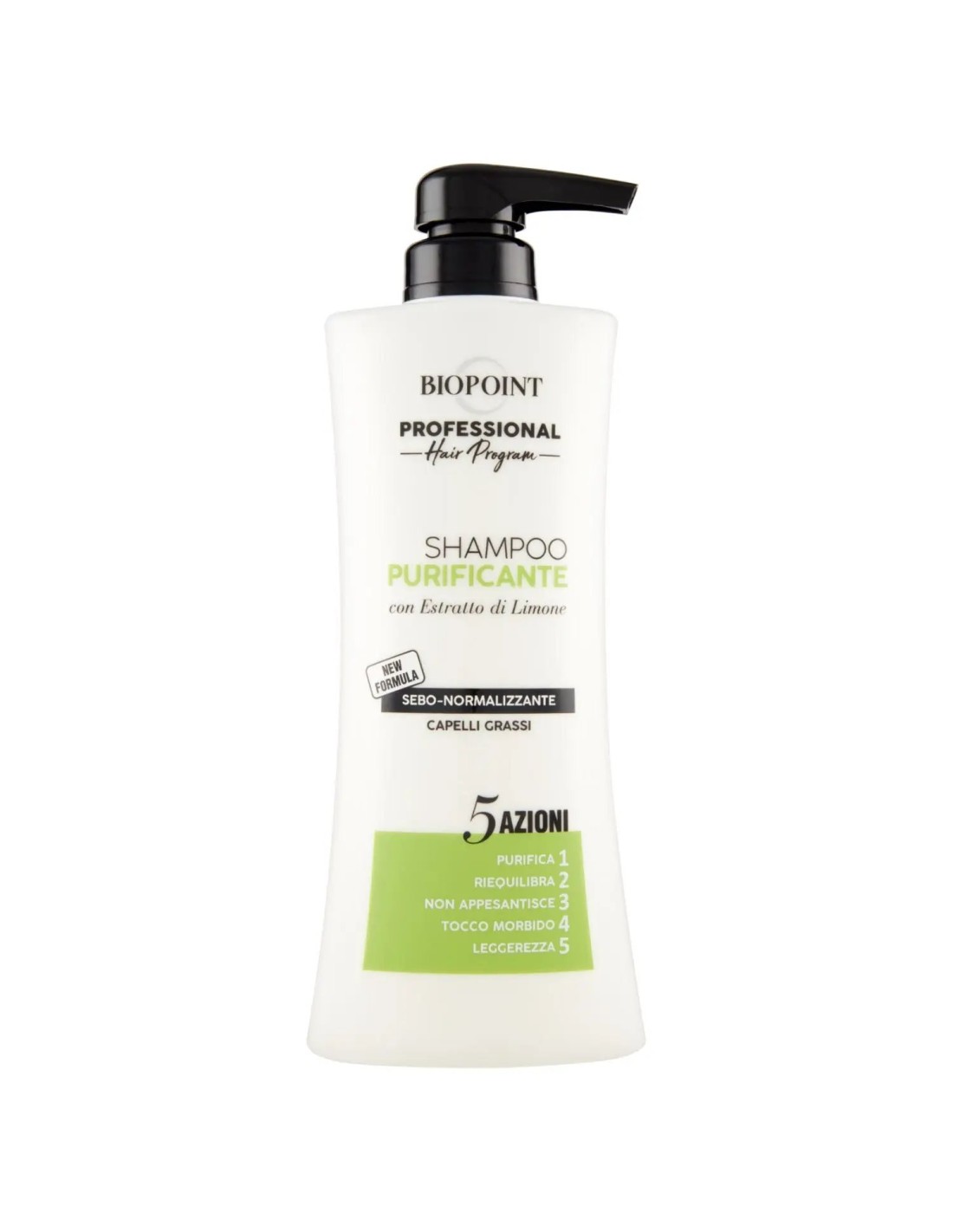 Biopoint Professional Shampoo Purificante Sebo Normalizzante con 5 azioni per capelli grassi e cuoio capelluto oleoso. Formula purificante con zinco PCA e mentolo rinfrescante regola l'eccesso di sebo, donando freschezza duratura. Ideale uso frequente: purifica in profondità senza seccare.