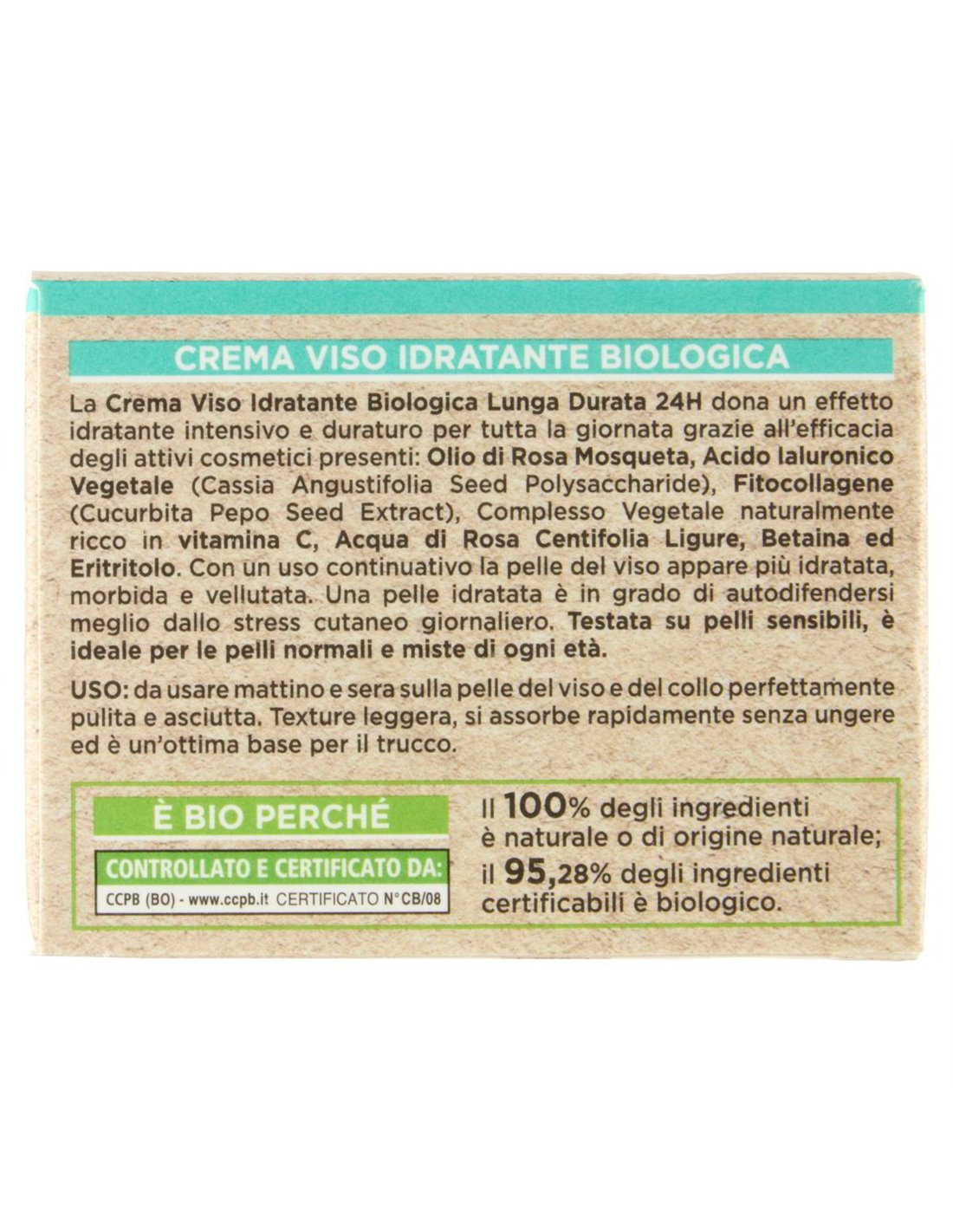 🔥 La Crema Viso Idratante Biologica Lunga Durata 24H dona alla pelle un effetto idratante intensivo grazie alla sinergia di attivi di origine vegetale selezionati con cura: l'Olio di Rosa Mosqueta Bio lavora insieme all'Acido Ialuronico Vegetale (Cassia Angustifolia Seed Polysaccharide), al Fitocollagene da semi di Cucurbita Pepo, all'Acqua di Rosa Centifolia Ligure, alla Betaina vegetale protettiva e all'Eritritolo, zucchero naturale ad azione idratante. Una formula che rafforza la barriera fisiologica della pelle, rendendola più resistente allo stress cutaneo quotidiano.