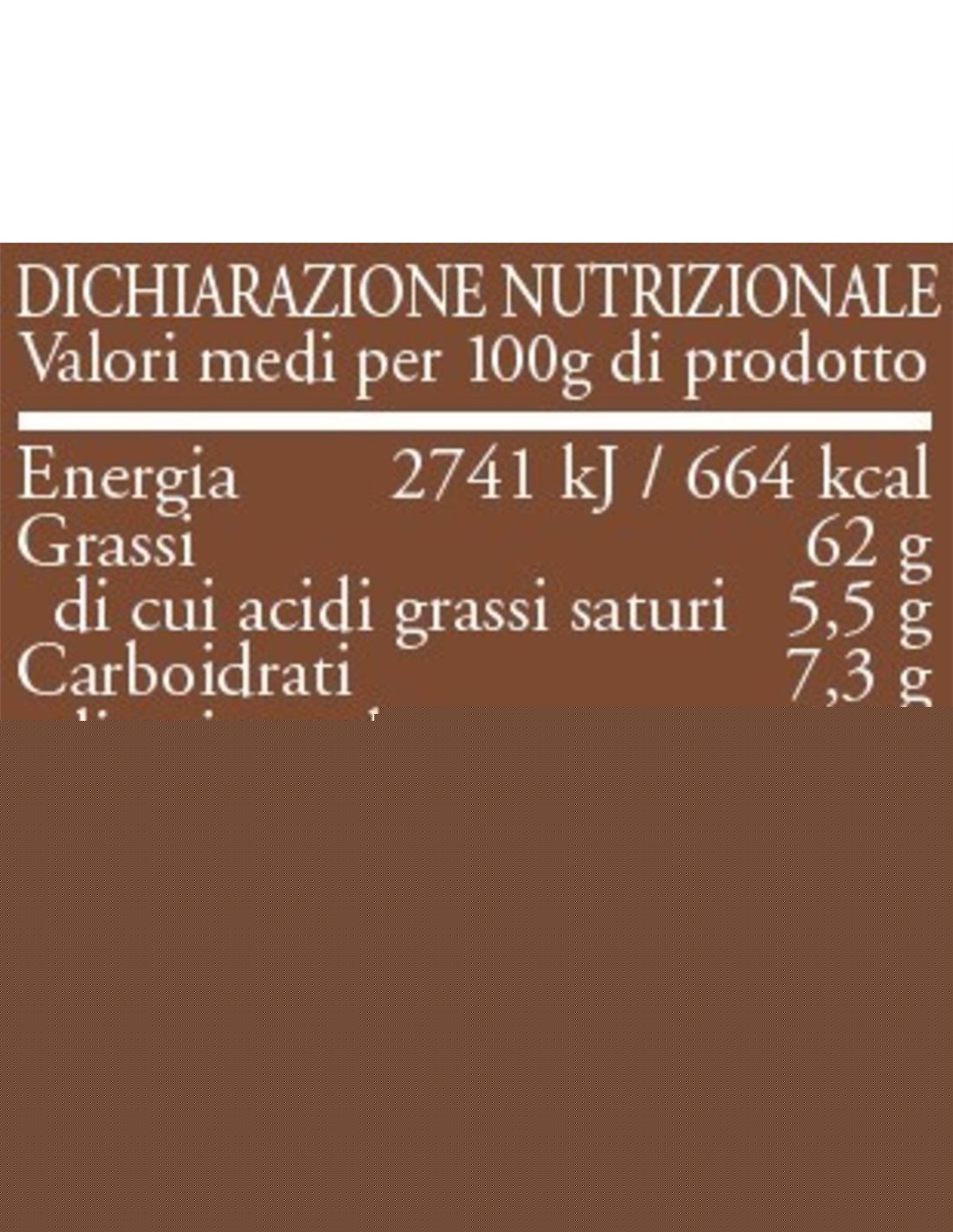 Energia: 2741 kJ/664 kcal | Grassi: 62 g | Saturi: 5,5 g | Carboidrati: 7,3 g | Zuccheri: 4,2 g | Fibre: 8,5 g | Proteine: 15 g | Sale: 0,01 g