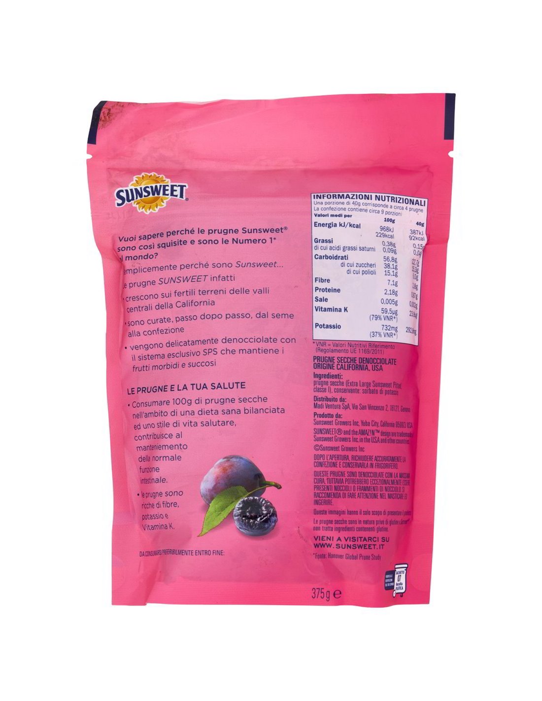 Prugne secche (extra large, Sunsweet Pitted, classe I), conservante: sorbato di potassio (E202).
