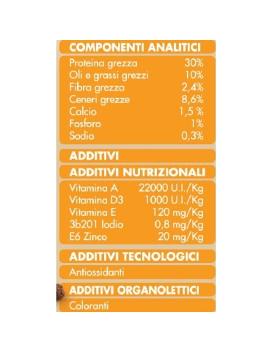 Cereali, carni e derivati (carni min. 14% di cui pollo 4% e tacchino 4%), sottoprodotti di origine vegetale, oli e grassi, estratti di proteine vegetali, lieviti, sostanze minerali, ortaggi (verdure min. 4%), pesci e sottoprodotti dei pesci, semi, frutta.