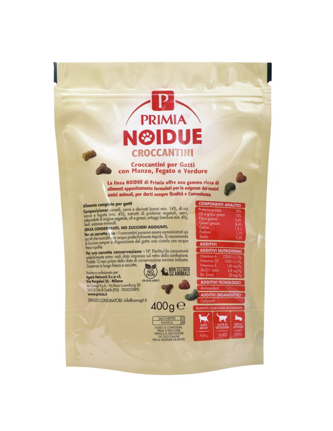 Scegliere i croccantini PRIMIA NOIDUE significa optare per un prodotto che riflette un'attenzione scrupolosa alla qualità e all'integrità degli ingredienti. Ogni sacchetto da 400g è il frutto di un processo produttivo rigoroso, pensato per preservare il valore nutritivo di ogni componente e garantire la massima sicurezza alimentare. È la dimostrazione che un'alimentazione sana può essere al tempo stesso pratica e straordinariamente efficace, contribuendo attivamente alla longevità e al benessere complessivo del tuo gatto. La fiducia riposta in PRIMIA è la garanzia di un'eccellenza che si rinnova in ogni singolo pasto.