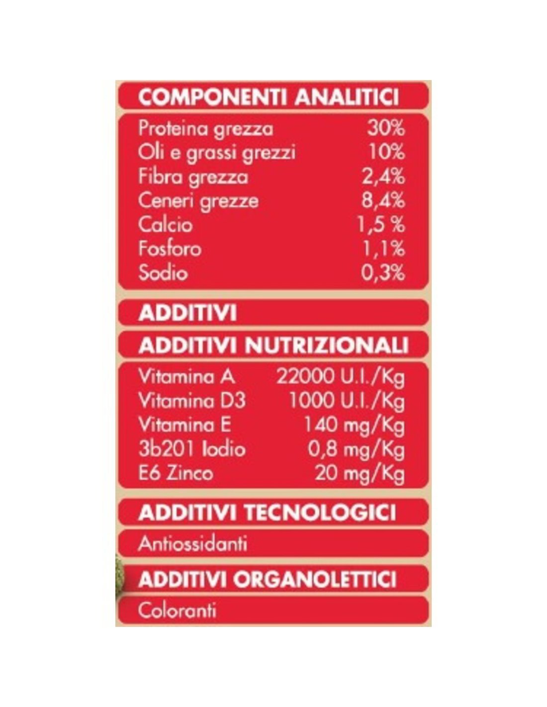 Proteina grezza: 30% | Oli e grassi grezzi: 10% | Fibra grezza: 2,4% | Ceneri grezze: 8,4% | Calcio: 1,5% | Fosforo: 1,1% | Sodio: 0,3%