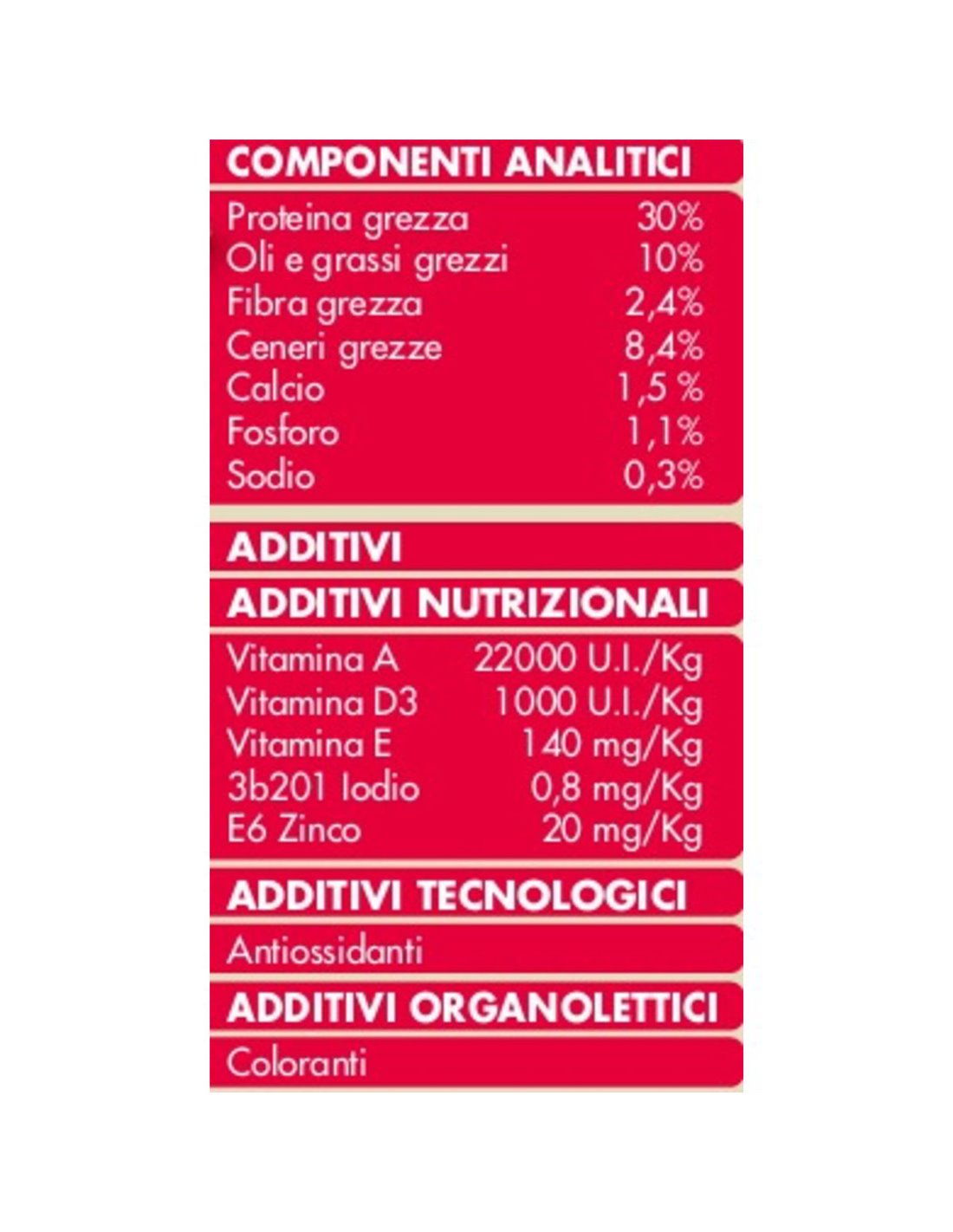 Additivi Nutrizionali: Vitamina A 22000 U.I./Kg, Vitamina D3 1000 U.I./Kg, Vitamina E 140 mg/Kg, 3b201 Iodio 0,8 mg/Kg, E6 Zinco 20 mg/Kg.