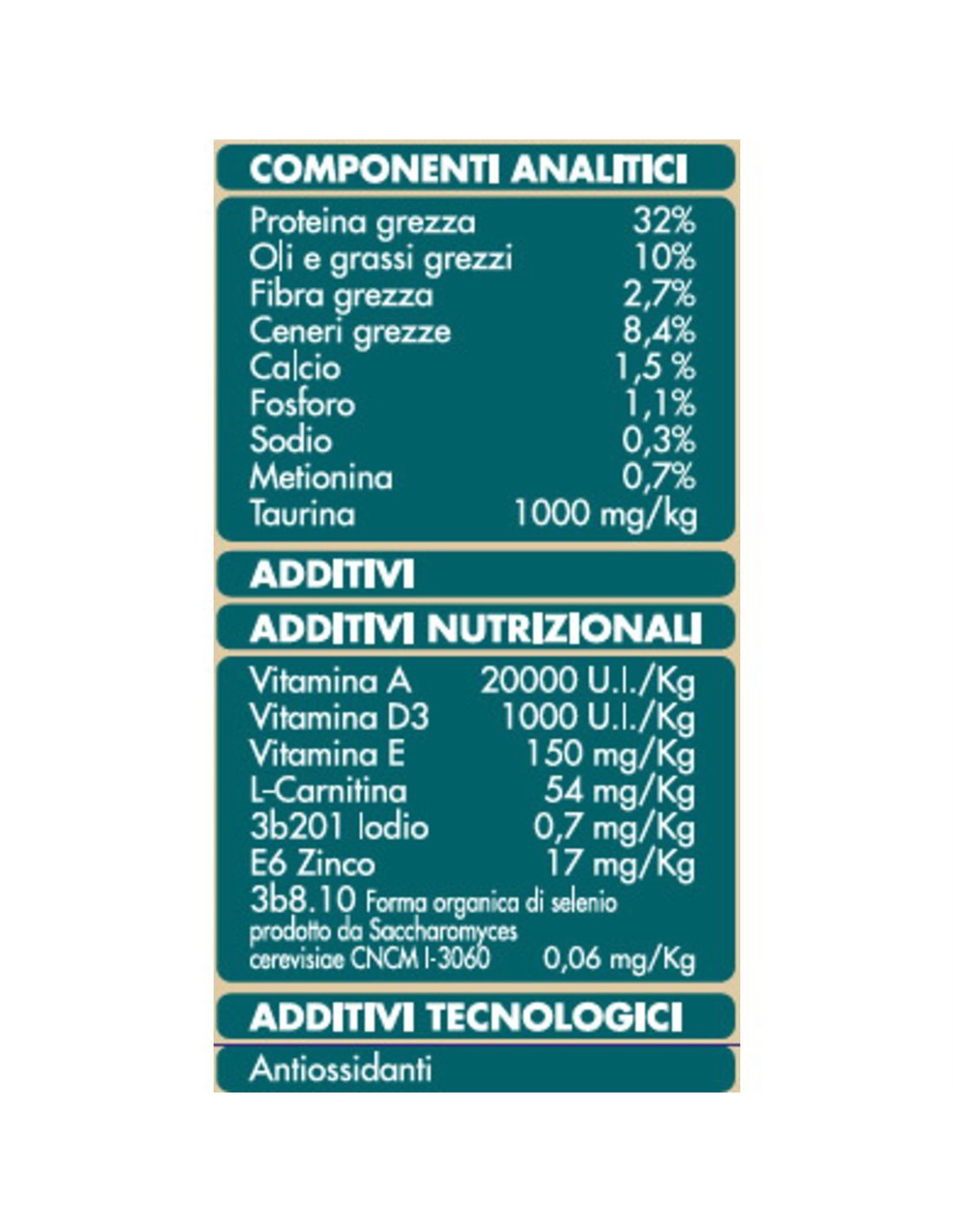 Proteina grezza: 32% | Oli e grassi grezzi: 10% | Fibra grezza: 2,7% | Ceneri grezze: 8,4% | Calcio: 1,5% | Fosforo: 1,1% | Sodio: 0,3% | Metionina: 0,7% | Taurina: 1000 mg/kg