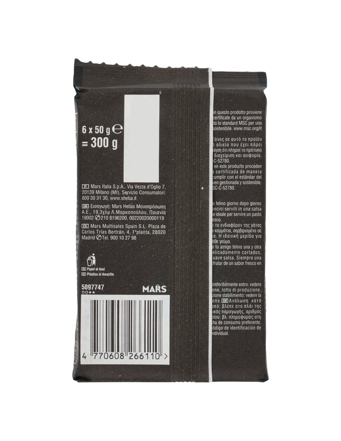 🐟 I Sheba Délices du Jour in Salsa con Salmone, Tonno e Trota sono un alimento umido completo per gatti adulti in pratico formato multipack da 6 bustine da 50 g. Una selezione marina in salsa pensata per i gatti che amano il pesce: bocconcini finemente tagliati di salmone, tonno e trota immersi in una salsa morbida e ricca, privi di coloranti e conservanti artificiali.