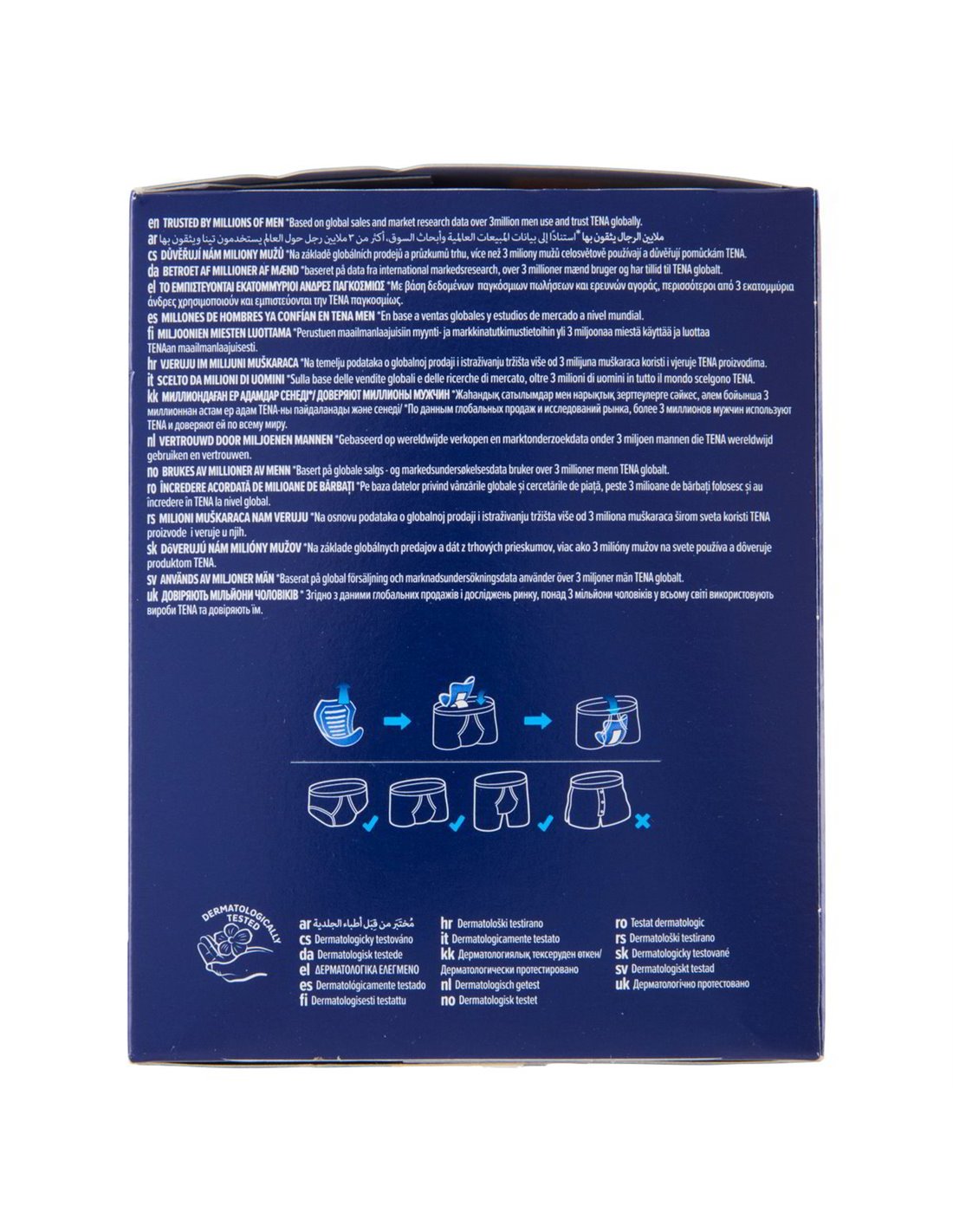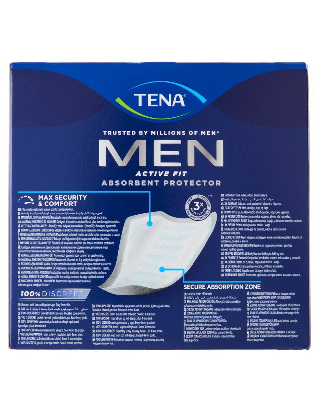 La linea TENA Men nasce dall'osservazione semplice che l'anatomia maschile è diversa da quella femminile e merita una soluzione progettata dall'inizio per quella forma. La forma a conchiglia — esclusiva di TENA Men — si adatta con precisione alla fisicità maschile, garantendo un posizionamento stabile e una copertura efficace esattamente dove serve. Lo spessore di soli 4 mm rende il prodotto invisibile sotto qualsiasi tipo di abbigliamento, dal pantalone formale al bermuda sportivo.