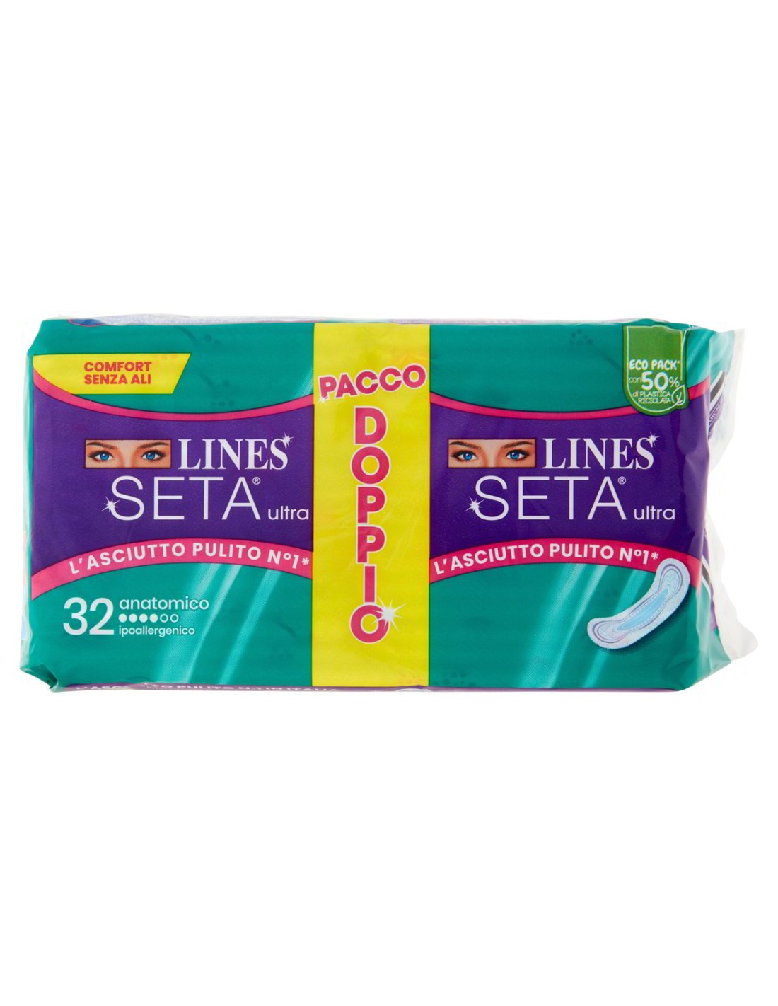 ✨ Comfort senza ali, libera da ogni vincolo. Assorbenza 4 su 6, formato pacco doppio da 32 pezzi con confezione Eco Pack realizzata con il 50% di plastica riciclata.